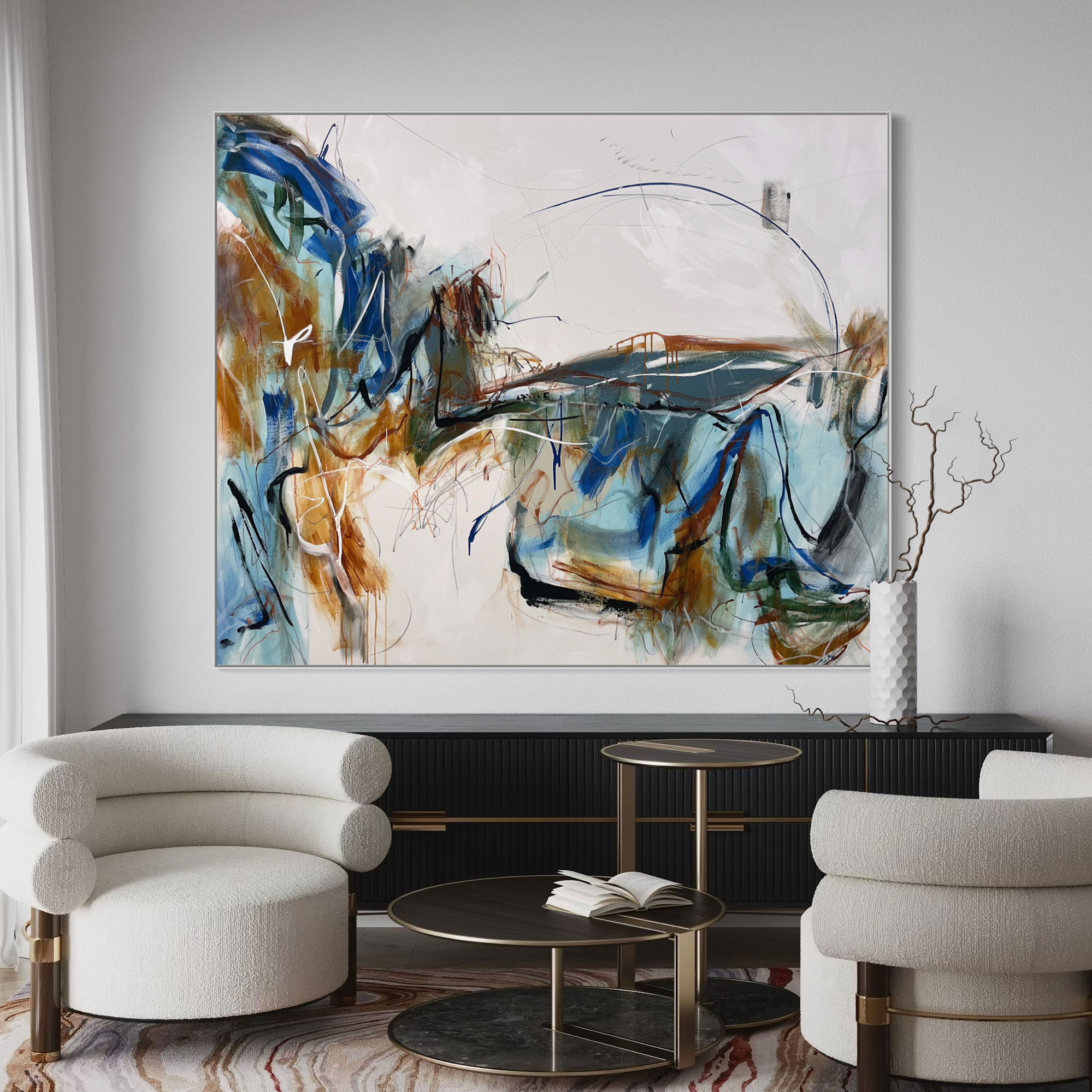 This striking statement piece combines complex mark making and texture with a beautifully balanced palette of ochre, orange, mocha, beige, and white with cool grey, black and greens blended with a combination of graduated blue hues found in the landscape.