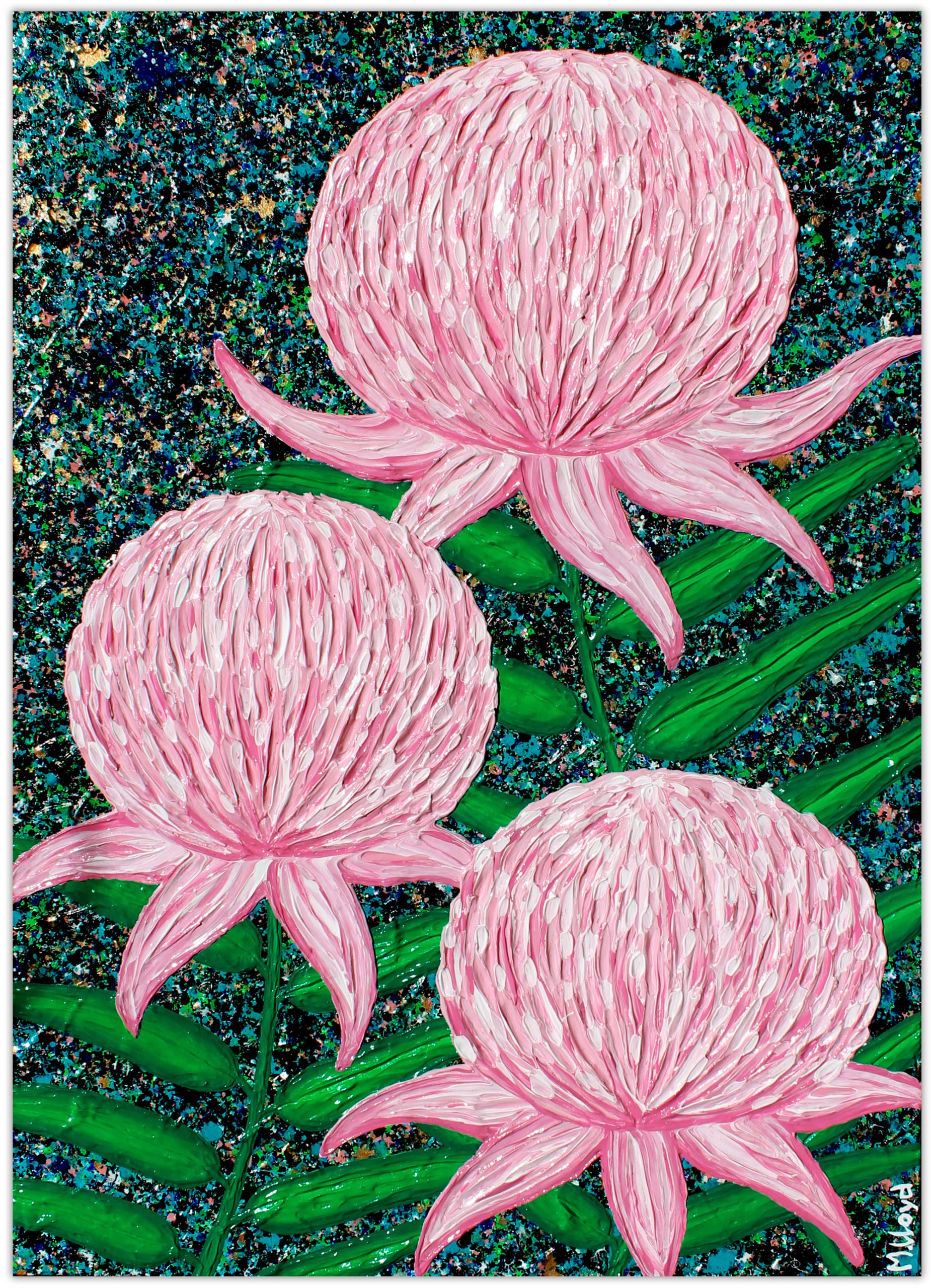 Waratah Flowers Abstract Textures – This is my first Waratah flowers painting. Inspired by my love of our Australian outback nature. Ive selected to do the soft pink variety as I love the contrast with the moody but electric background. This is an abstract take on the Waratah and exaggerating its form. Very heavy textures applied to the flowers, leaves and background. The gold metallics in the background pic up nicely in the light. Background is a mix of black, electric blues, turquoise, pink, white, greens, silver and gold. Would be a nice feature to a very contemporary space with black and white and indoor plants. The painting looks much better in real life vs a photo as hard to capture the true textures and details.