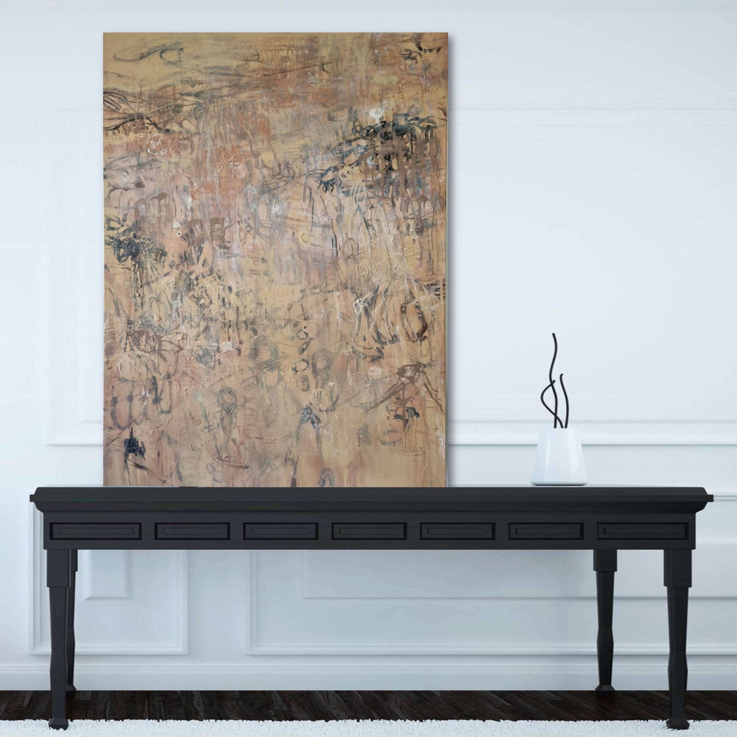 Shades, dilutions and pattern in muted neutrals, varied soft browns, grey, black, terracotta, sienna, sandstone and white. Featuring expressive mark-making and gestural brushwork this painting is contemporary and ambient in calming cool and warm natural tones.