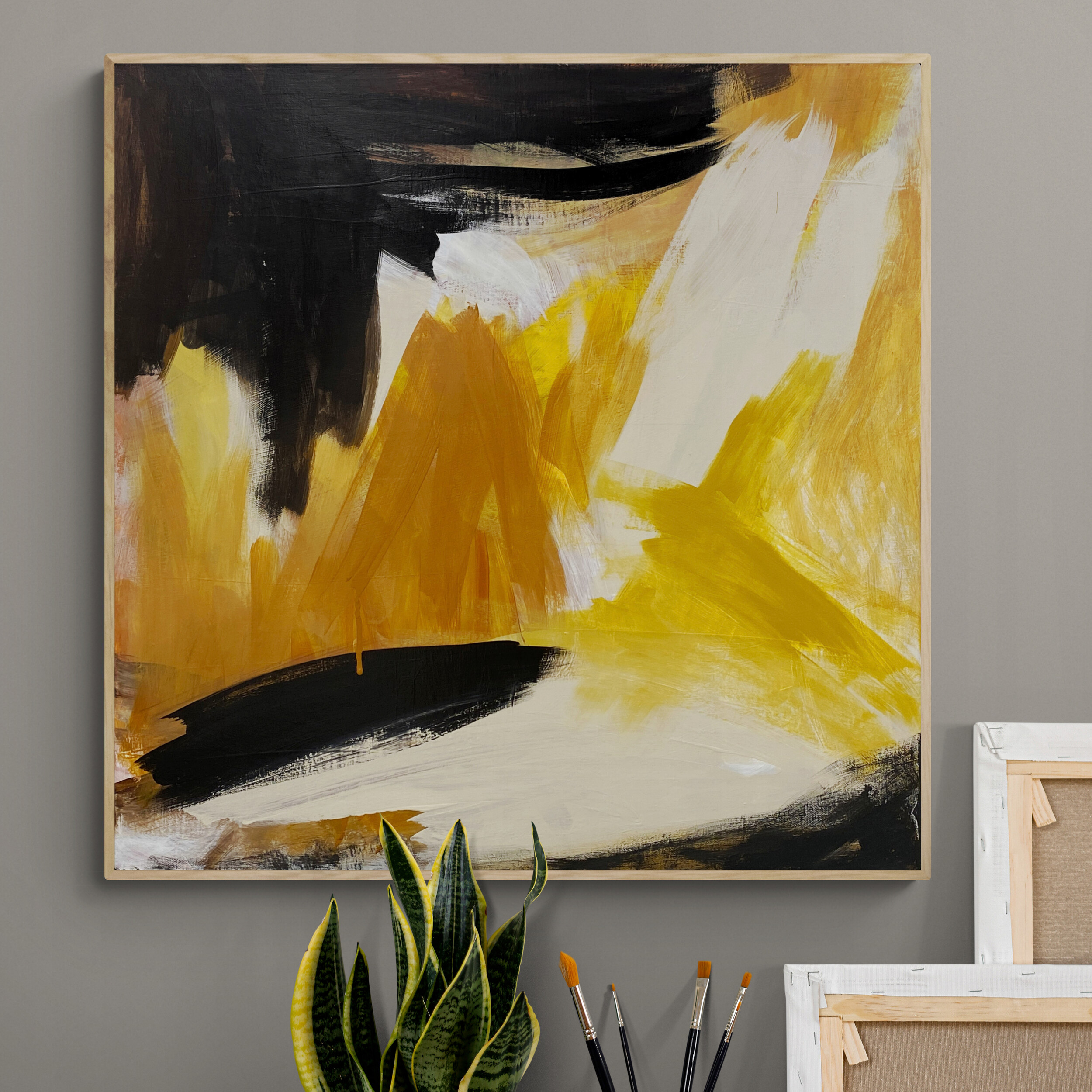 It is a beautiful earthy painting with a vibrant palette of light warm yellow and ochres, beige and browns, black and white.
