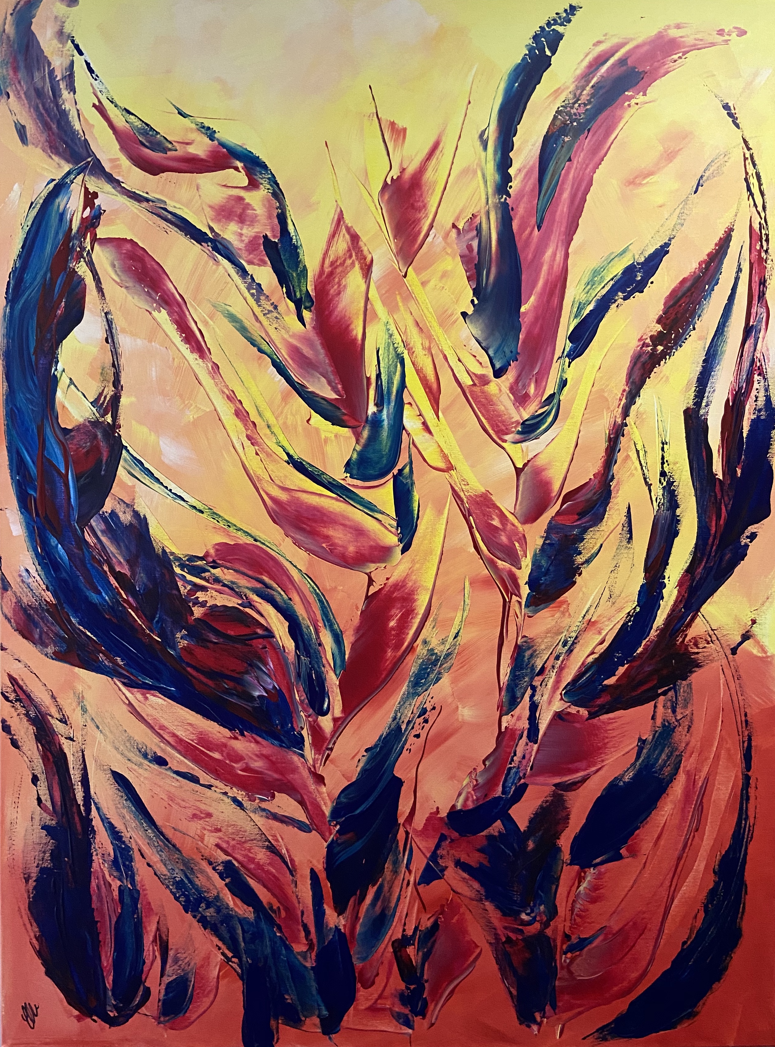 Warm Paradise by Carrie Welsh represents lush tropical botanical gardens. Bold deep colours this piece will brighten up your home. Acrylic on canvas. Ready to hang. Frame not included.