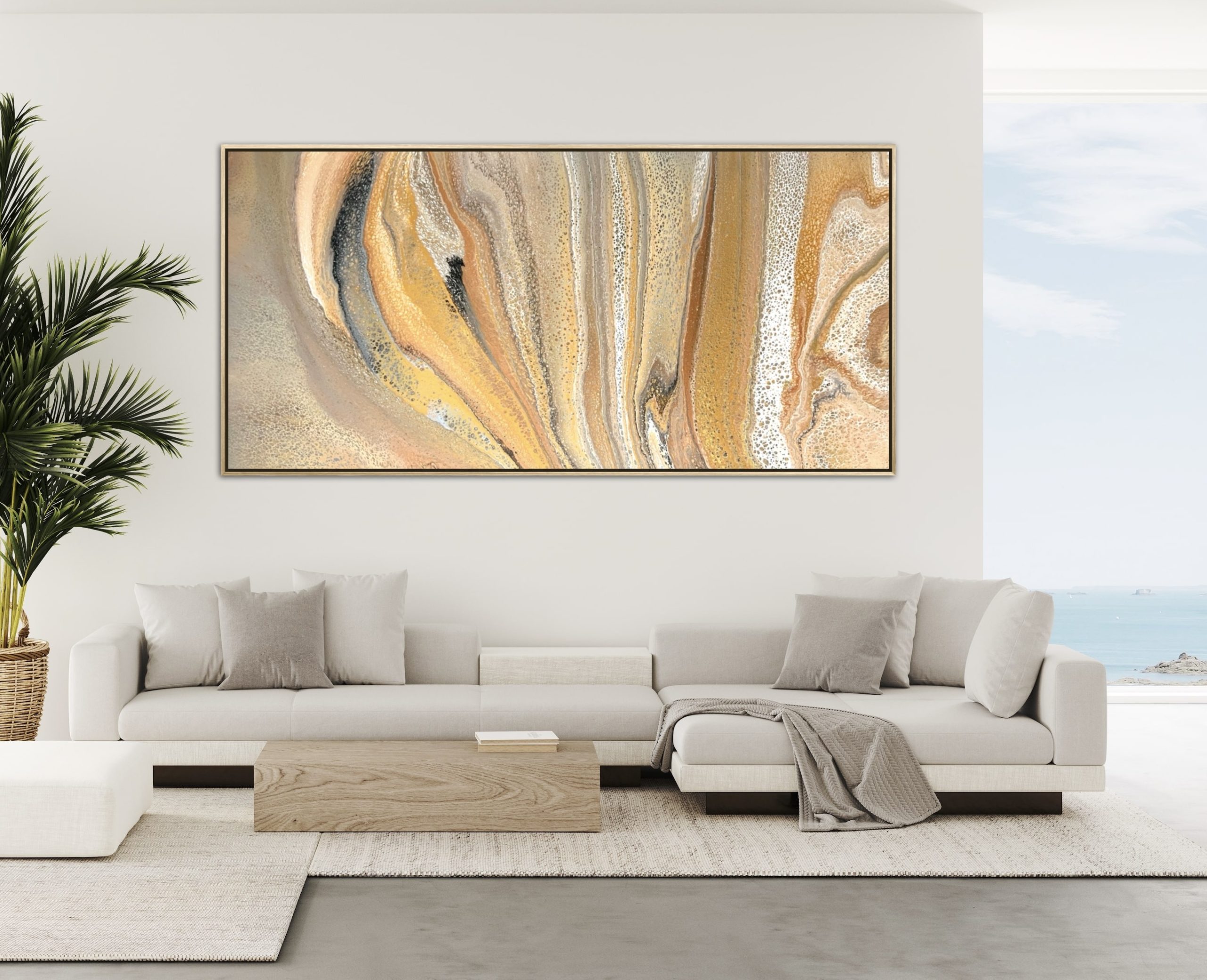 Warm Reflections by Angela Roskell – an extra large multi-directional abstract acrylic painting stretched and ready to hang. Exclusive to Art Lovers Australia