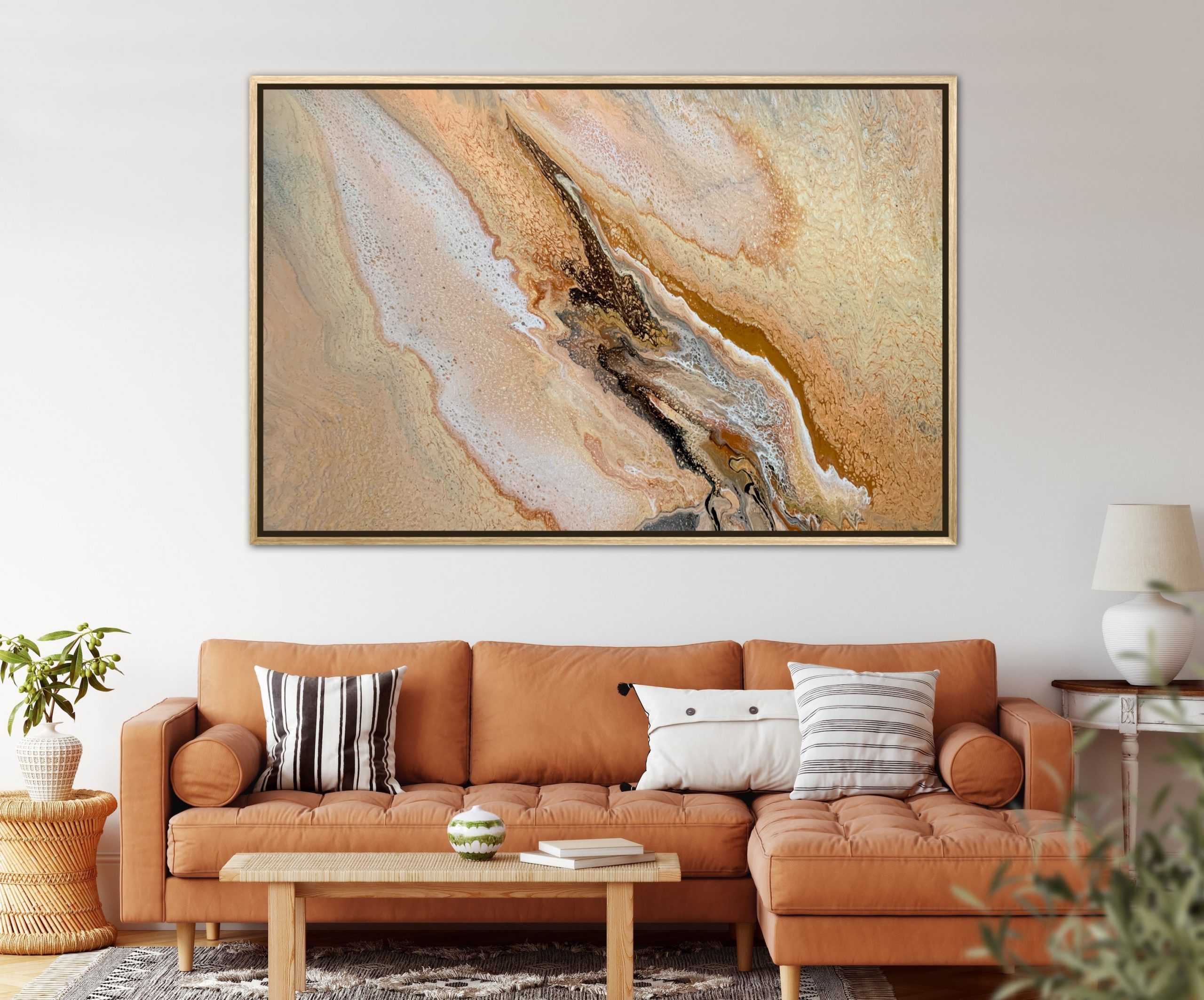 Warm Sands was created using various techniques combined to allow increased flow, interaction and separation of colours to create interesting patterns where pops of colour can be seen emerging from underneath. This added dimension adds lace and cells to the artwork creating an interesting and one of a kind painting that can never be replicated. A gorgeous variety acrylic pigments were used including metallic yellow & rose gold, bronze, , silver, cream, black and white.