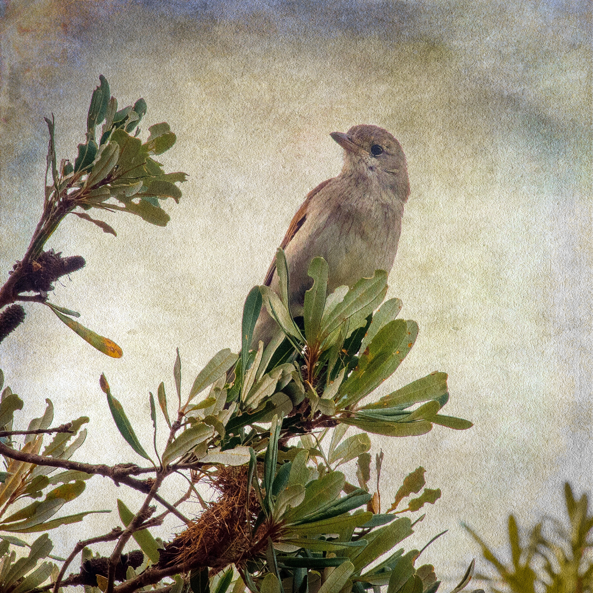 Under a gathering sky, a lone bird keeps watch, perched on a high vantage point. Original photograph with additional blended textural elements to create a cosy, painterly feel.