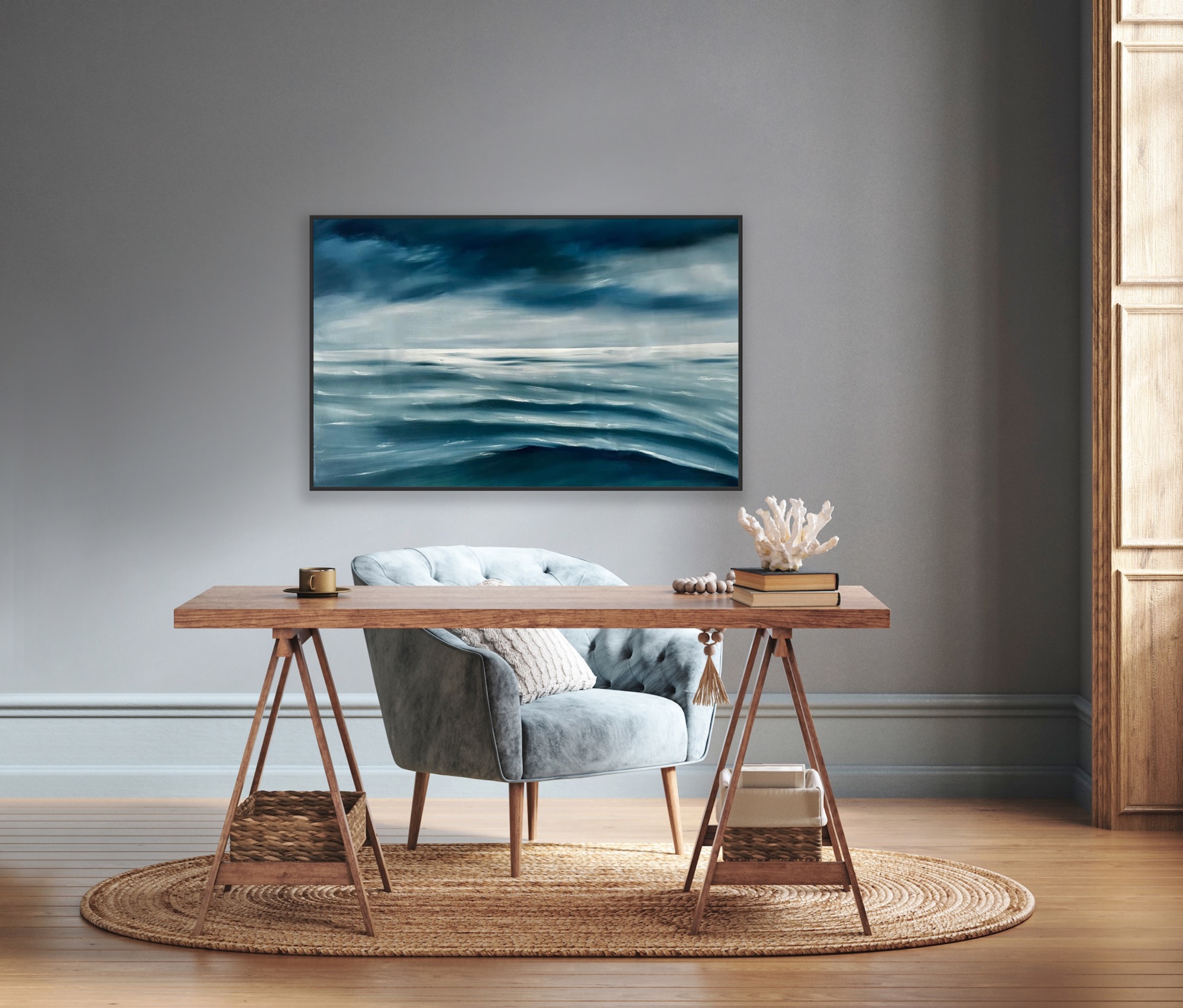 I hope this piece brings a sense of calm to a space which comes from a rainstorm passing. This oil painting is placed on sustainable canvas made from recycled plastic bottles keep them from damaging our environment,