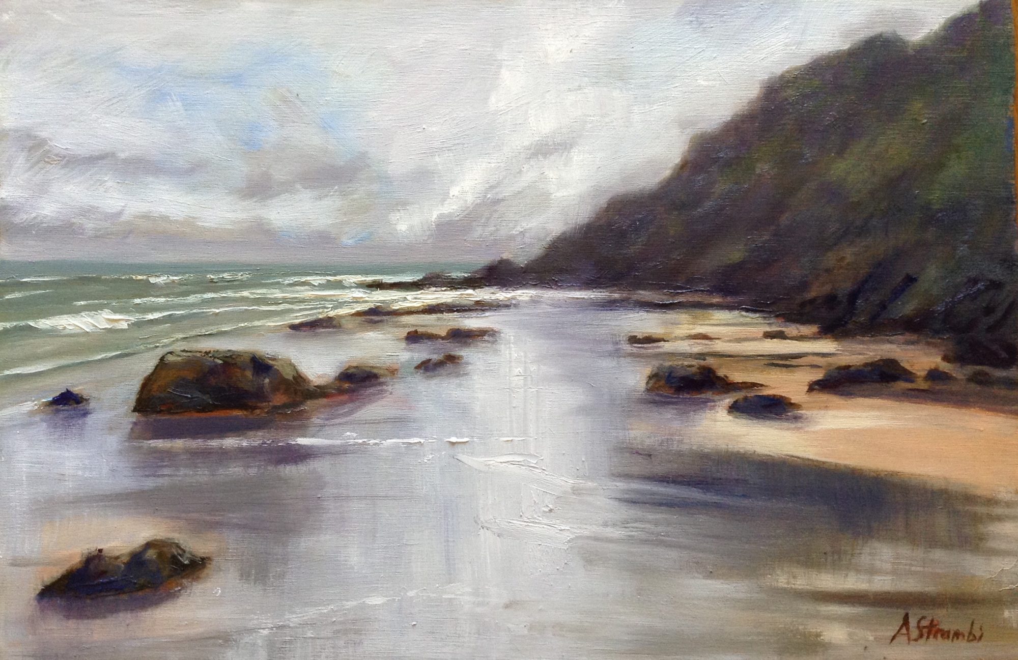 This is an original oil painting, inspired by an overcast day at Wategos Beach, northern NSW, with reflected light illuminating the wet sand and the sea colour a moody grey-green. This is a favourite spot, but this painting contrasts with the usual sunny seascape with its moody light.