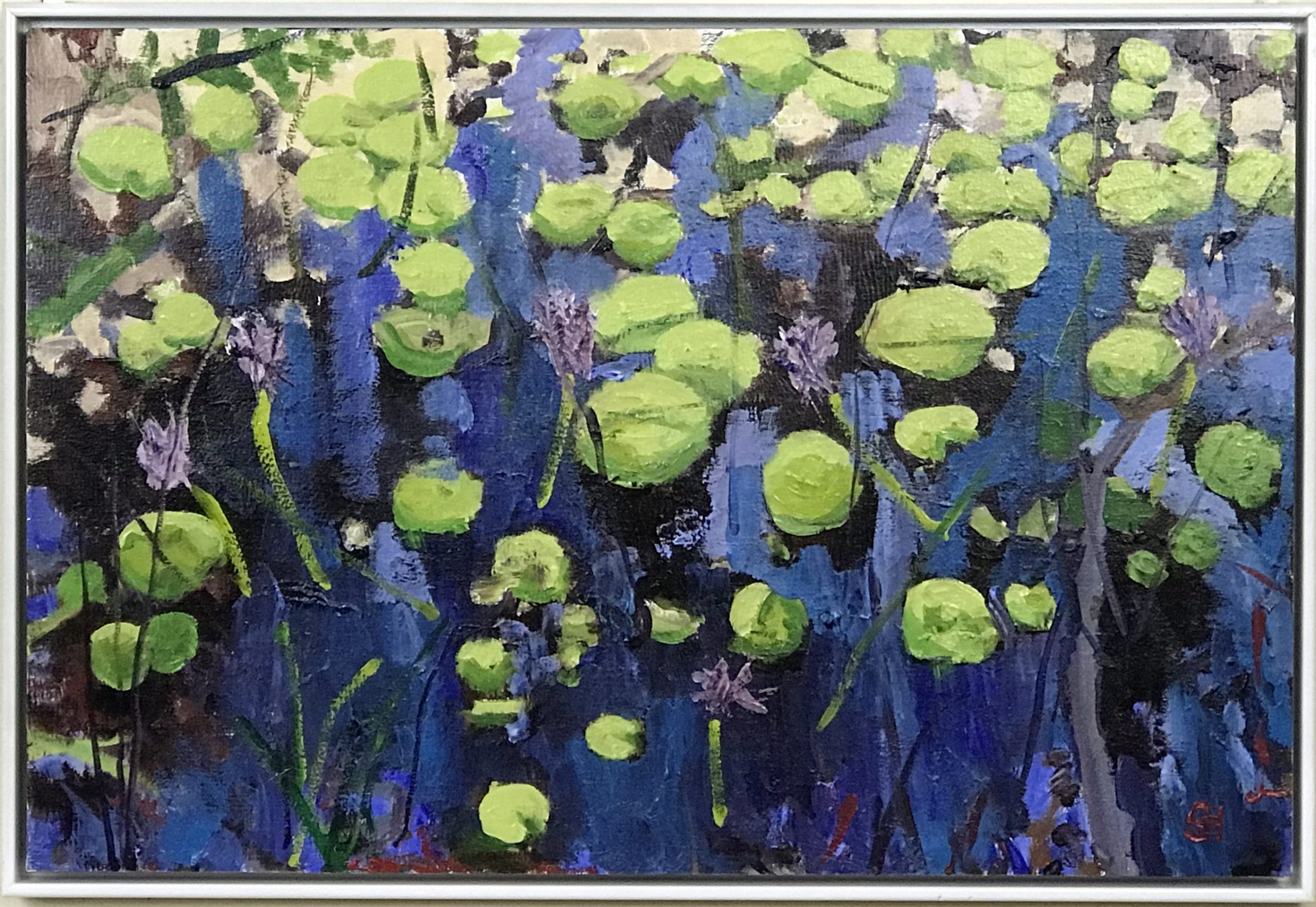 Water Lilies by Geoff Hargraves – A wet year means water everywhere, including a culvert beside a track home from the beach. a water pond with water lilies and the sky reflected on the still water. Oil on wood panel Framed with a white floating Frame, ready to hang.