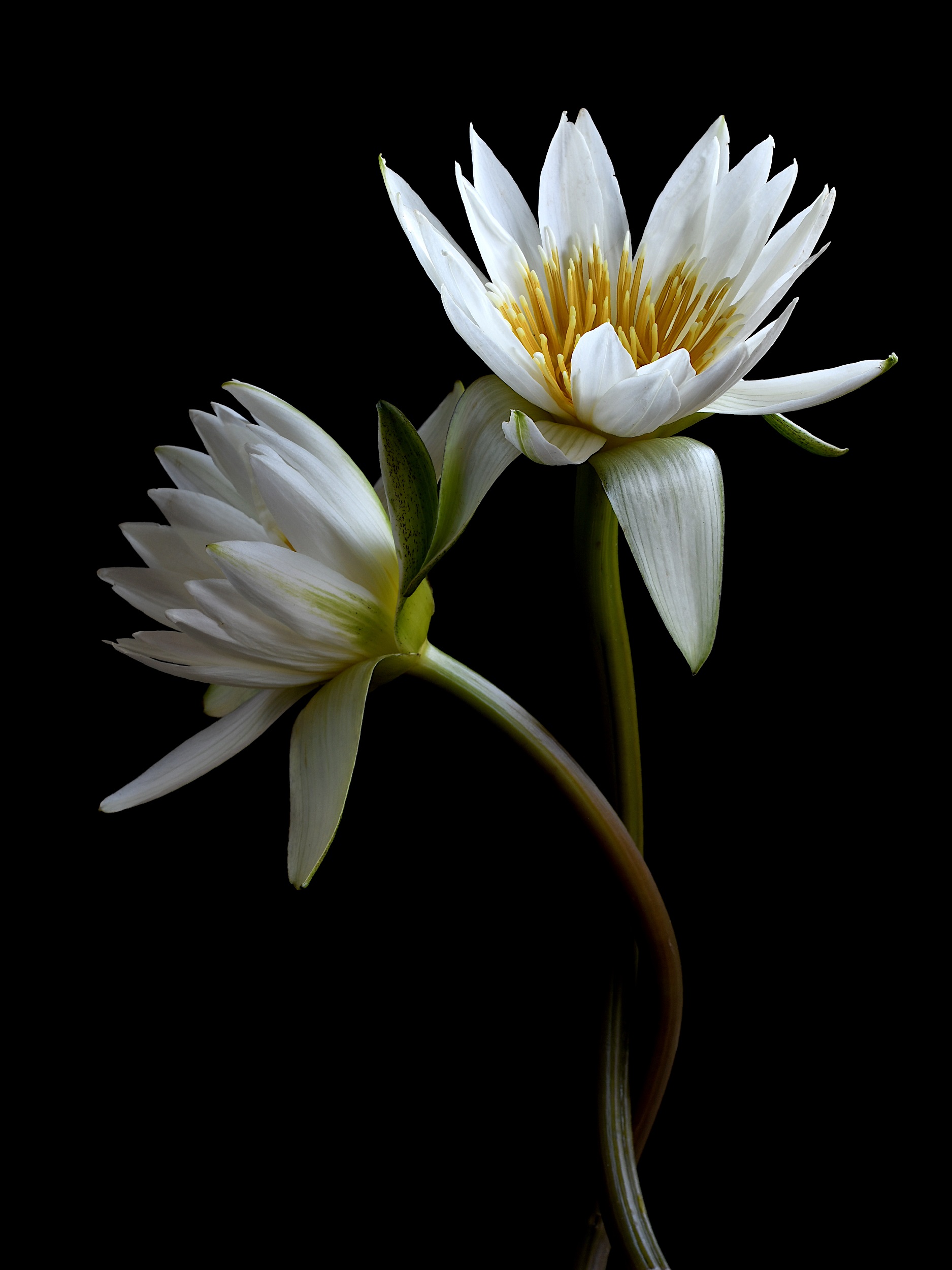 Elegant and beautiful, two water lilies naturally lit against a black setting creating a moody atmosphere.