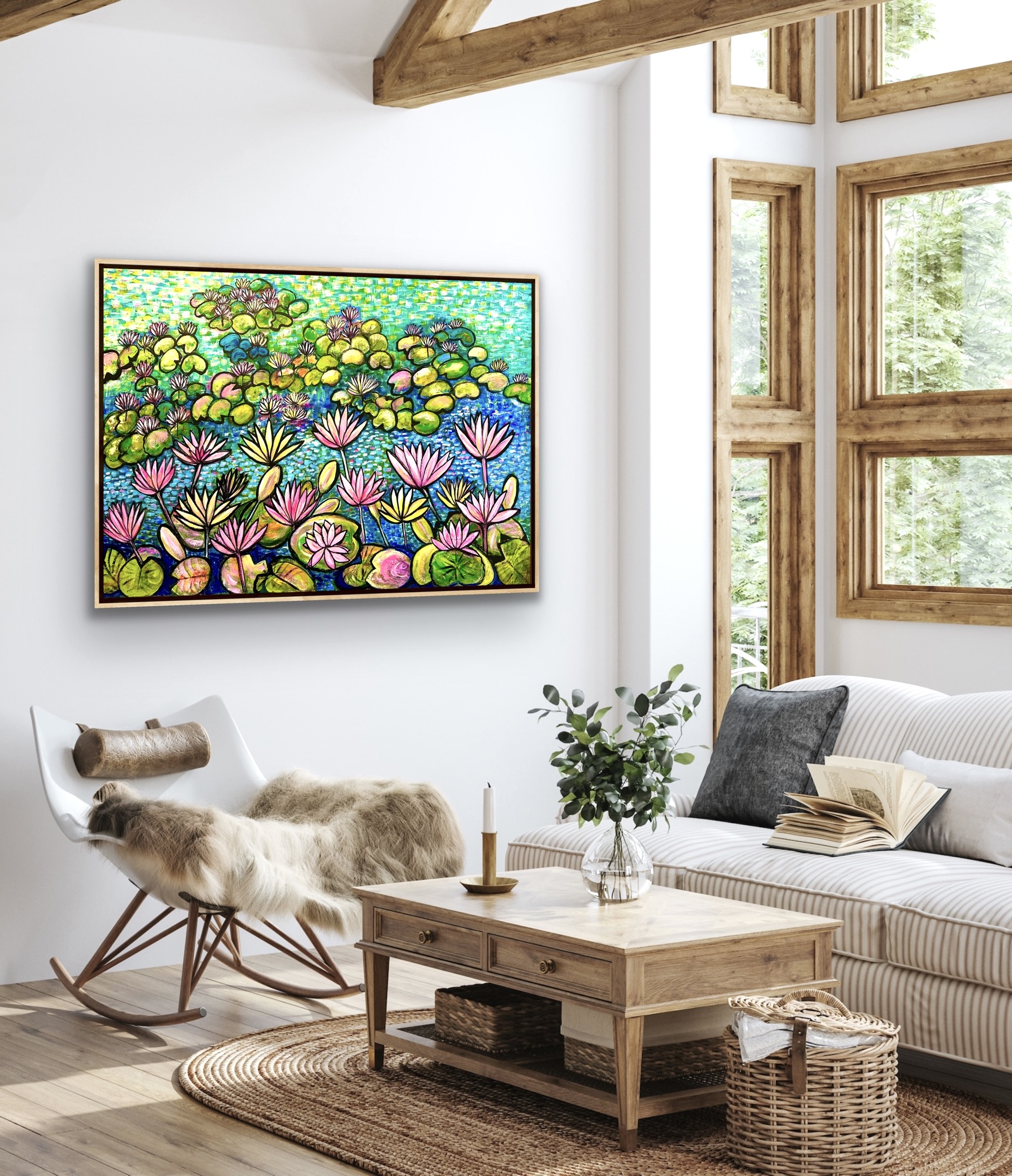 I was Inspired to paint my original water lily artwork after  walking beside a large pond where the pink, cream and yellow water lily flowers were reaching for the early winter sun.