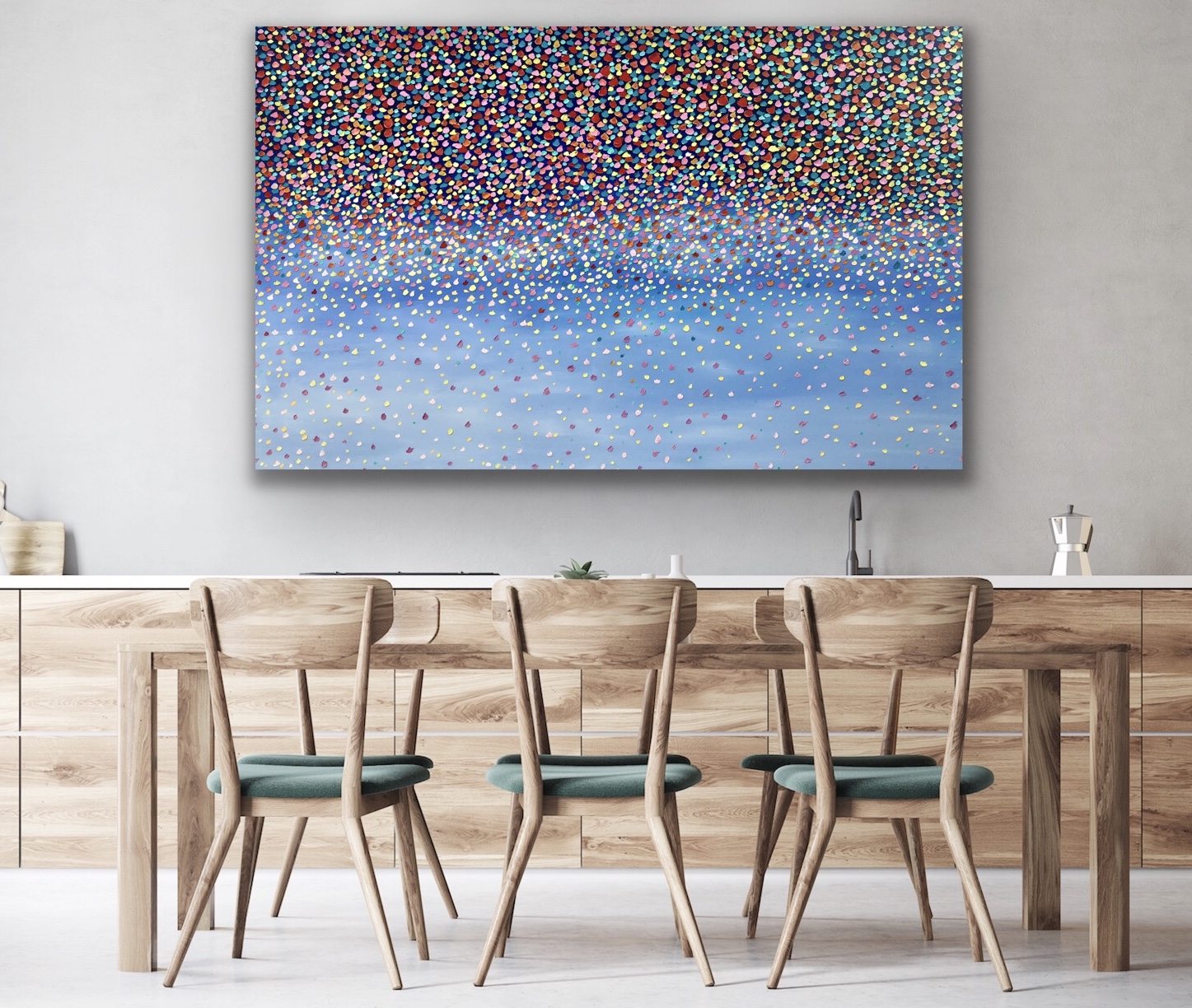 Waterfall Breeze – A waterfall of petals in the sky falling onto the landscape creating this explosion of petals. A wave of petals in the sky like musical notes creating their own song. The painting is painted with a pallet knife with very thick oil paint.Hope with this s work it makes the viewer feel very peaceful and tranquil. This painting is signed and dated 2020 at the back of the painting and comes with a certificate of authenticity.
