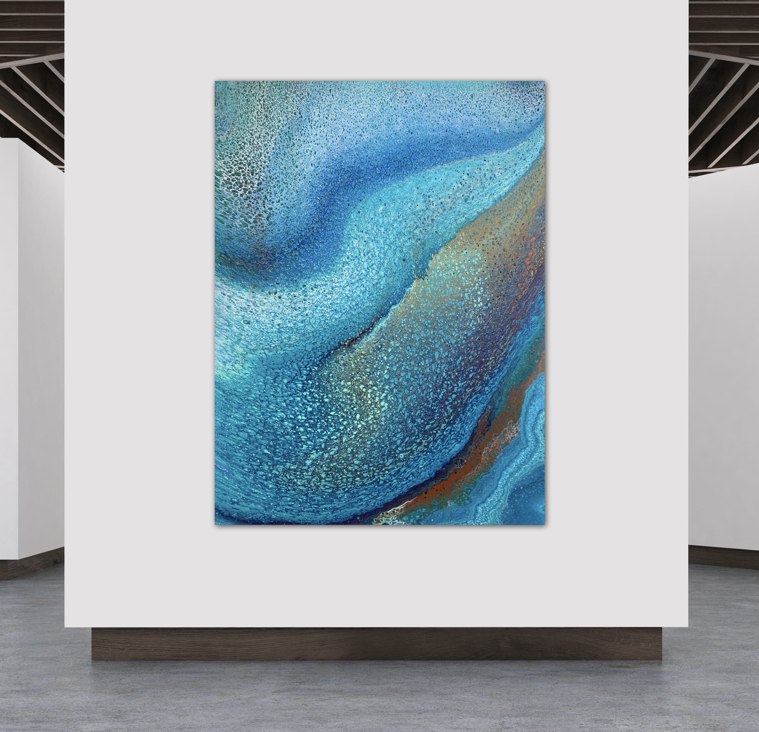 First Light was created using various techniques combined to allow increased flow, interaction and separation of colours to create interesting patterns where pops of colour can be seen emerging from underneath. This added dimension adds lace and cells to the artwork creating an interesting and one of a kind painting that can never be replicated. The metallic paint used reflects the shifting light beautifully really bringing the painting to life.
