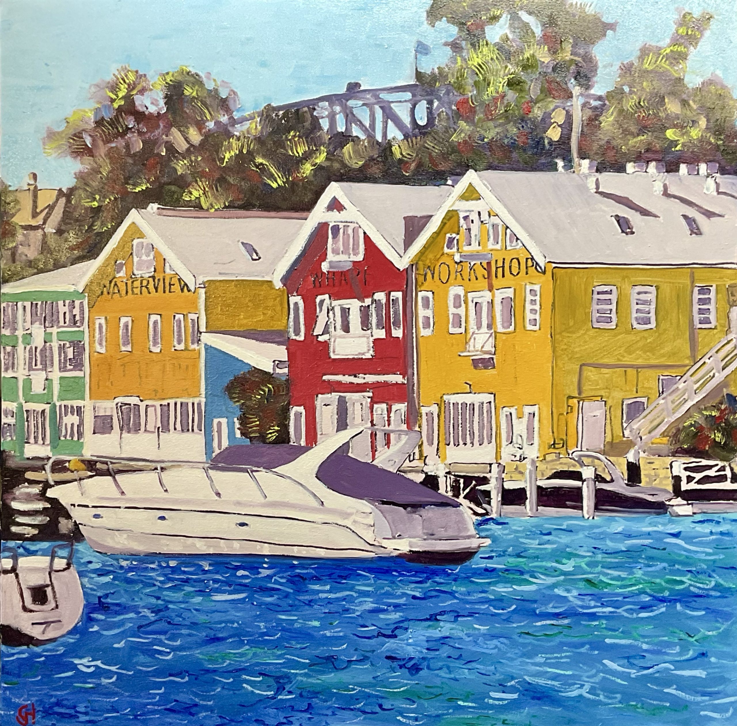 Many people on Ferries passing Balmain will know this view. The colourful offices of the Waterview Wharf are well know to passengers. The Sydney Harbour Bridge can be seen peeking from behind the trees.