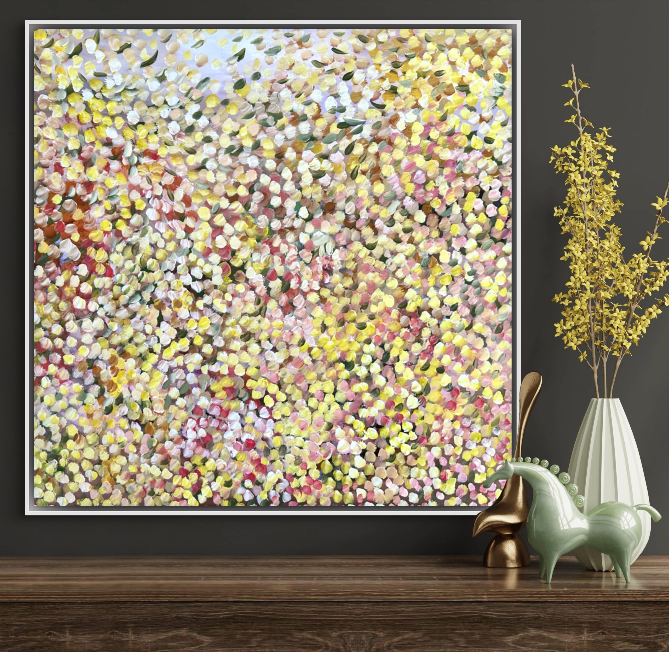 Wattle Symphony by Theo Papathomas is a painting with warm yellow colours of wattle flowers flying in the wind creating this beautiful bouquet of flowers over the landscape with lots of layers of paint. Wattle flowers weeping over the landscape creating so much movement . Dancing like musical notes creating their own symphony . A very peaceful and tranquil painting with so much depth. The painting does not come with an external frame. The painting is signed and dated at the back and comes with a certificate of Authenticity.