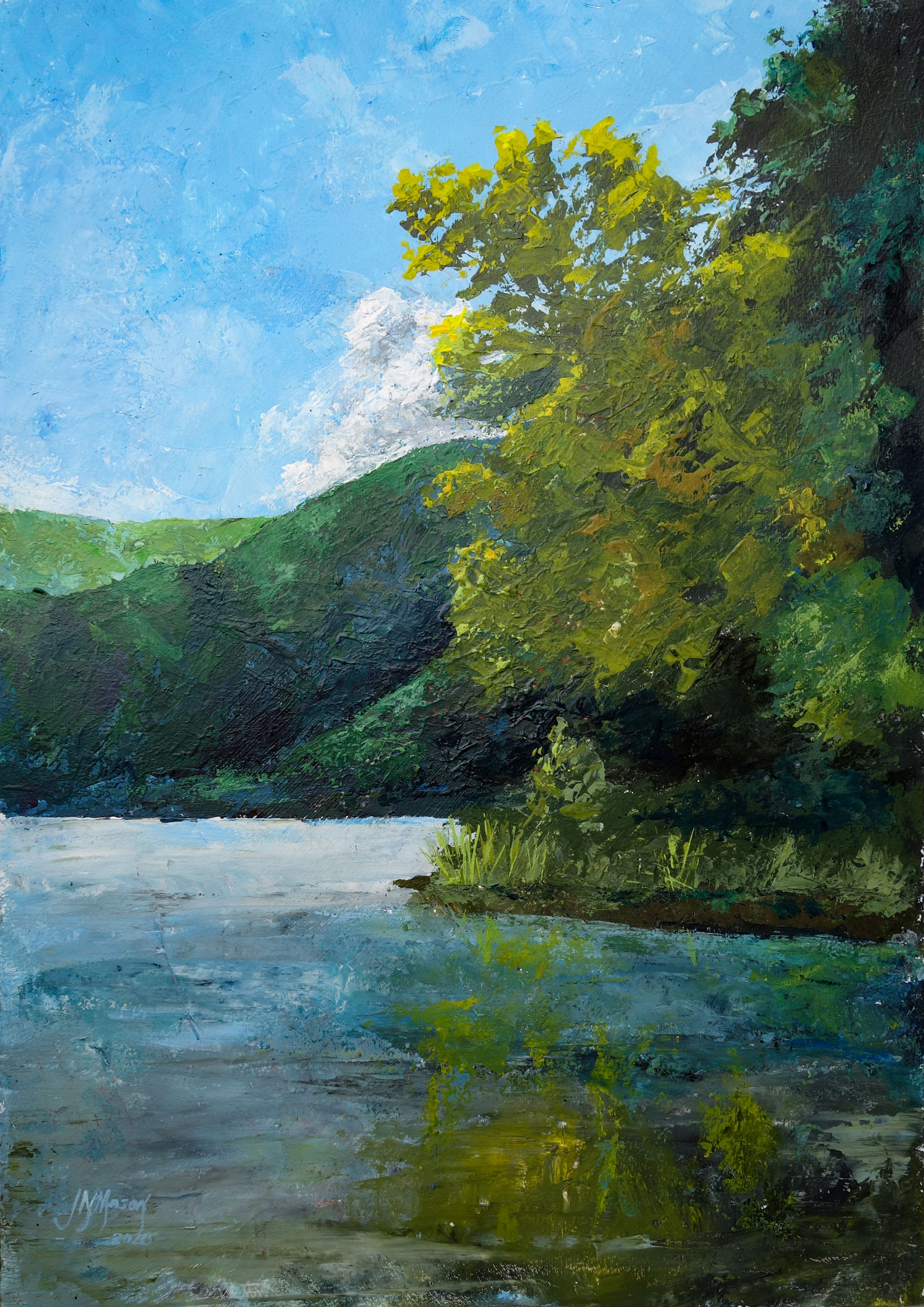 Golden Wattle tree beside a lake. Original artwork. Atelier Interactive Acrylic painted on 300gsm acid-free paper. Largely painted with a palette knife. Unframed. Shipped in a cardboard tube.