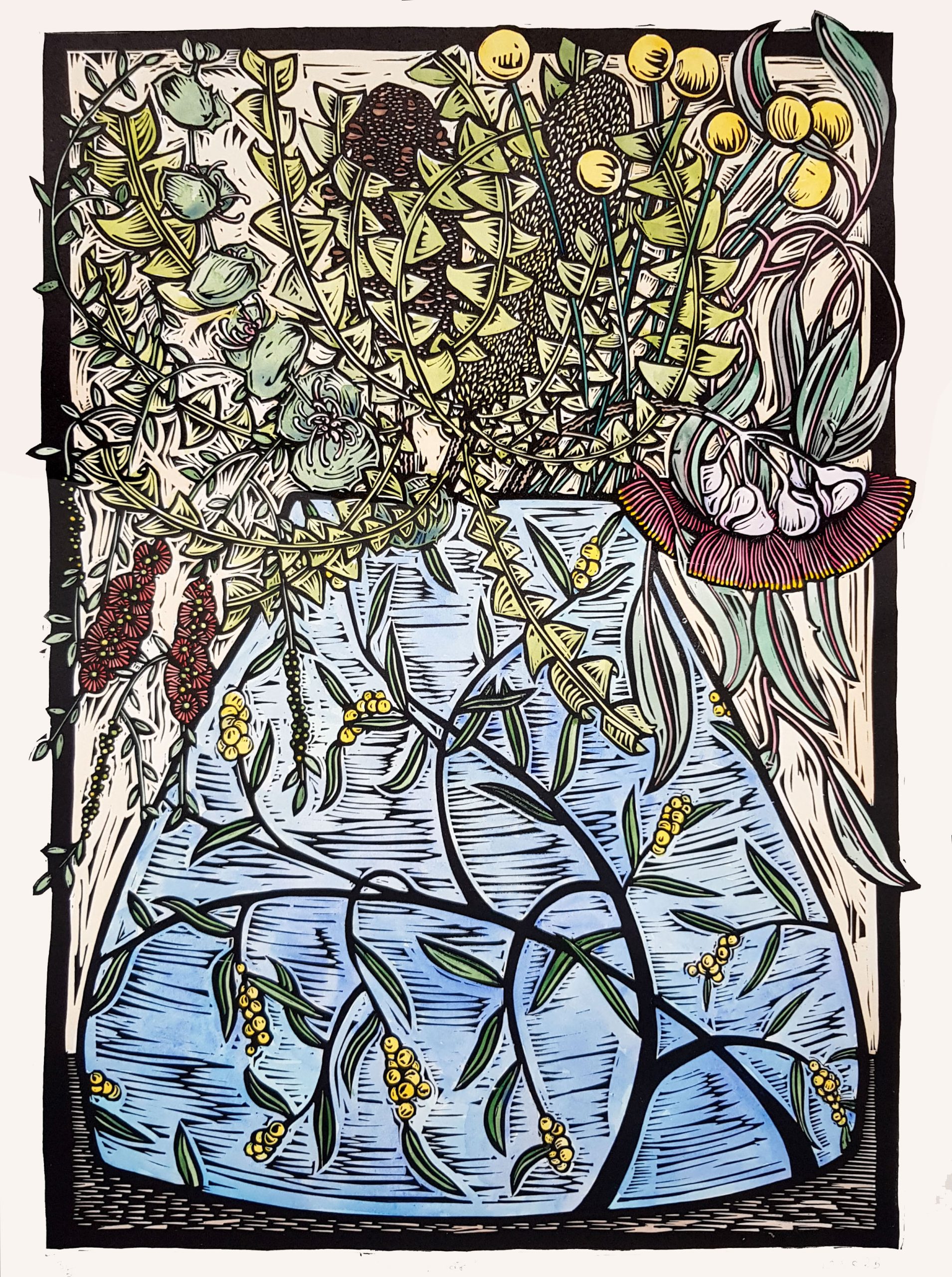 A still life of a wattle-decorated vase filled with banksia, billy button, bottlebrush, gum and hakea flowers. Inspired by the beautiful flowers blooming in WA in spring.