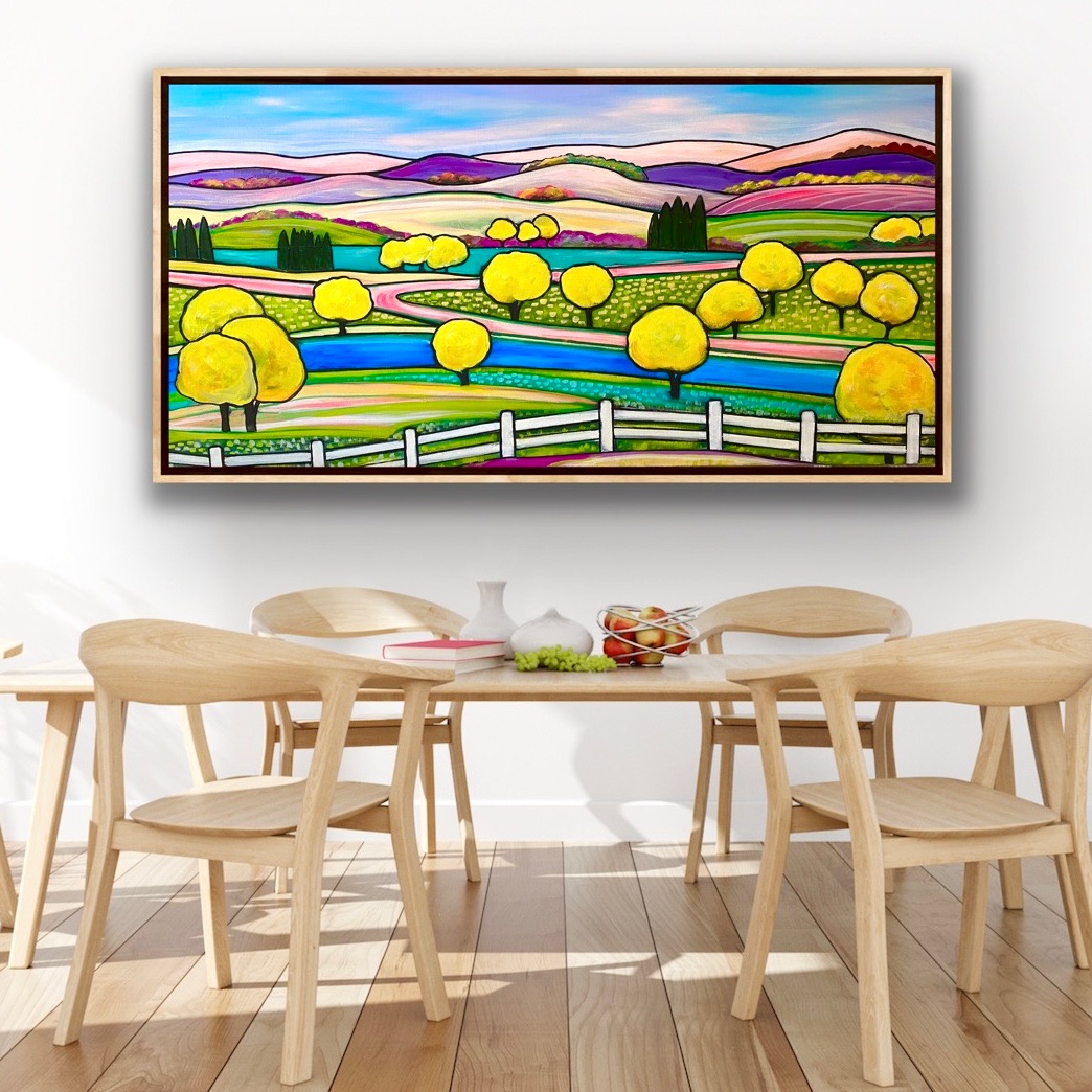 A quintessentially Australian modern landscape painting inspired by wattle country outside of Brisbane in July and August every year.