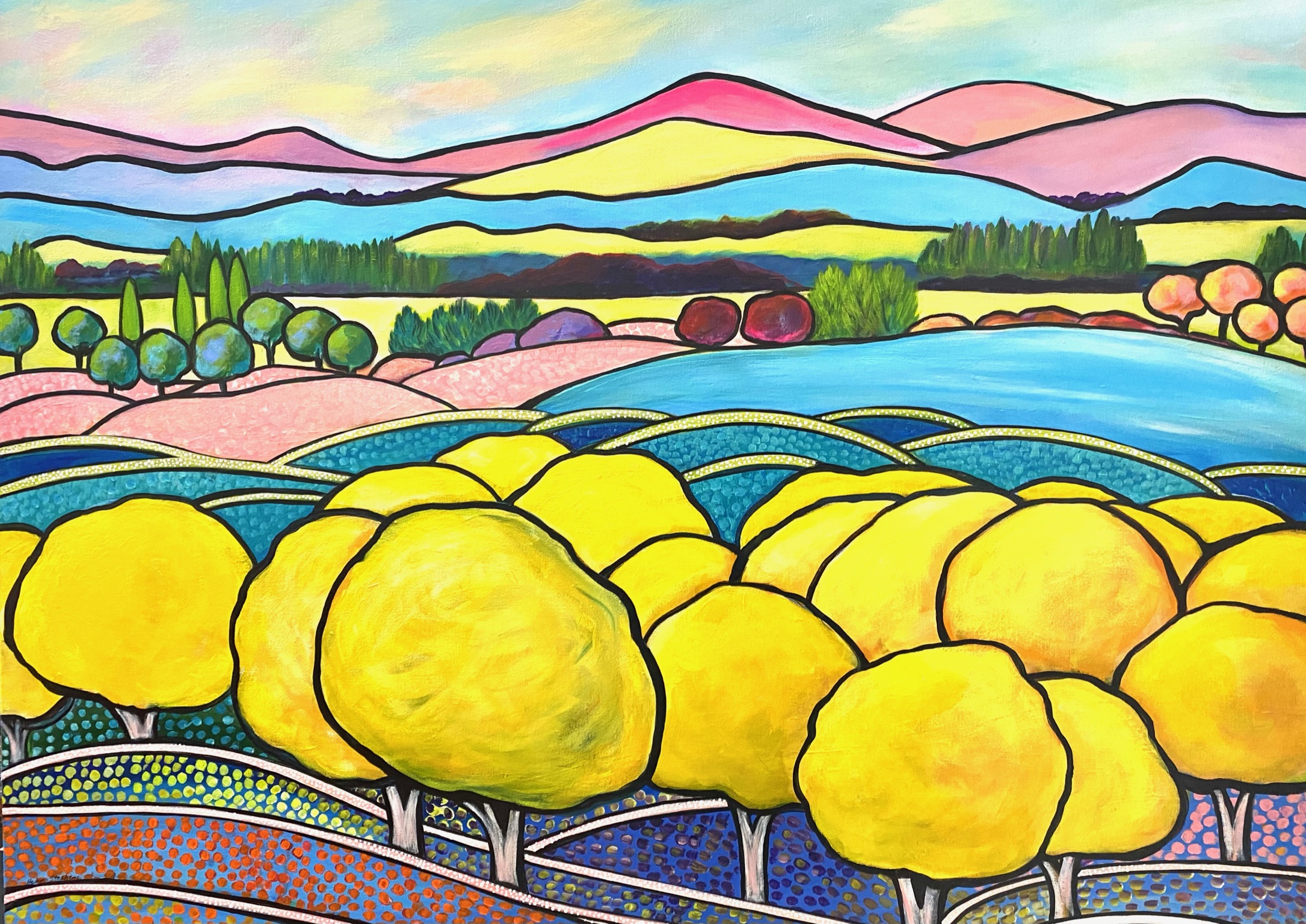 A modern, contemporary, non traditional painting of a beautiful stand of wattle trees in full flower, filling this gully with yellow sunshine…….I can’t wait for the wattles to start blooming again in July.