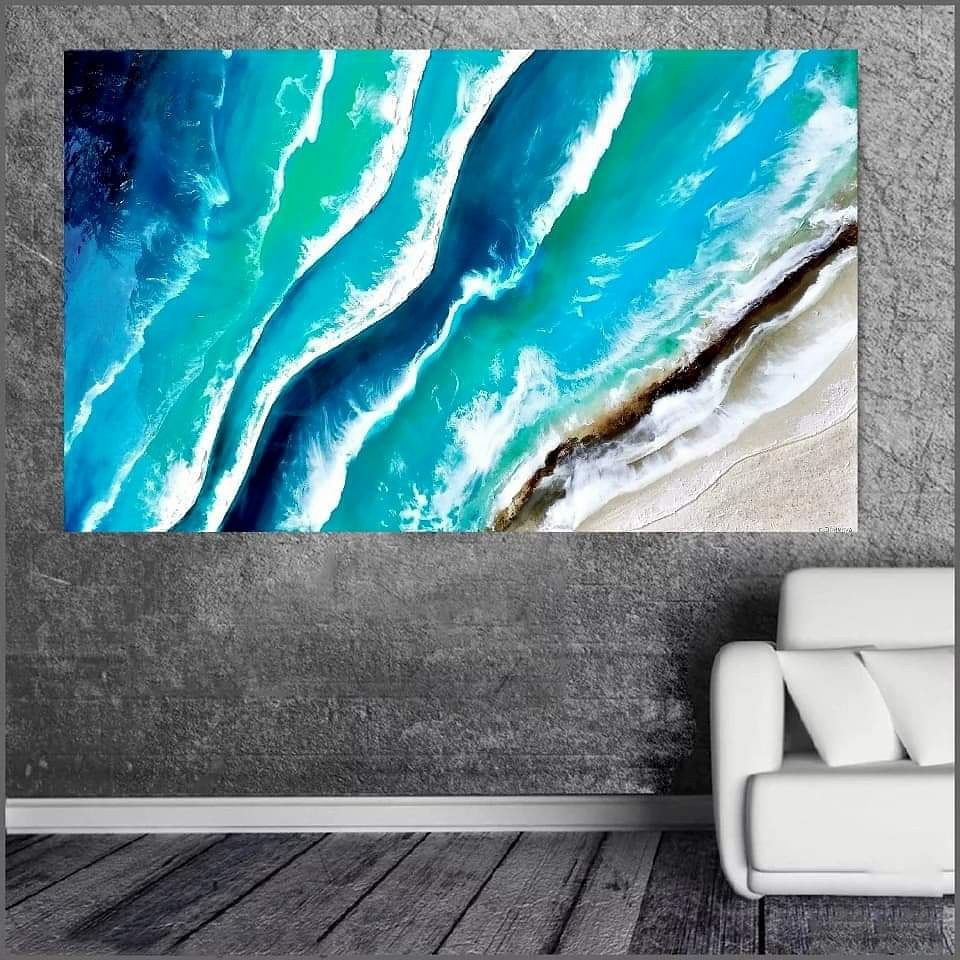 This artwork is very textured and is designed to have a 3D feel while showcasing the continuous movement of the ocean. To emphasise the impact of the continuous movement of the ocean as seen when viewing from the shore I have produced a rippled effect with the resin for the outer layer beyond the wave line.