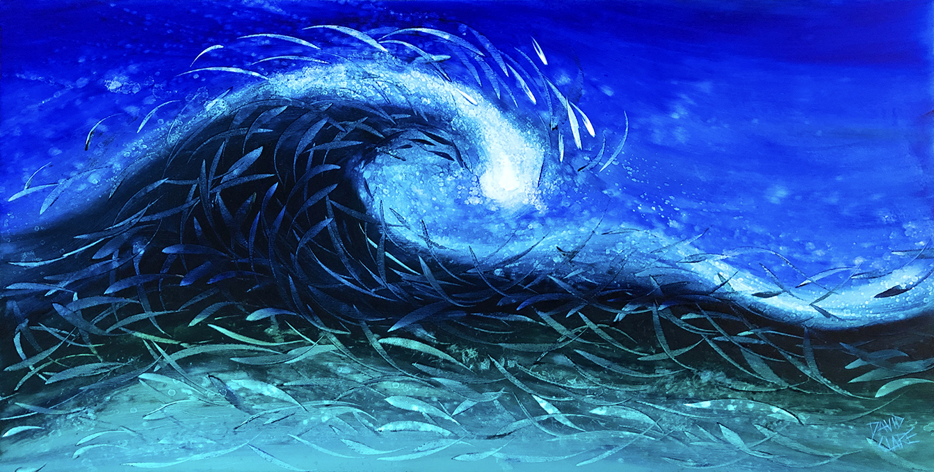 An abstract oil painting of a school of fish catching a wave