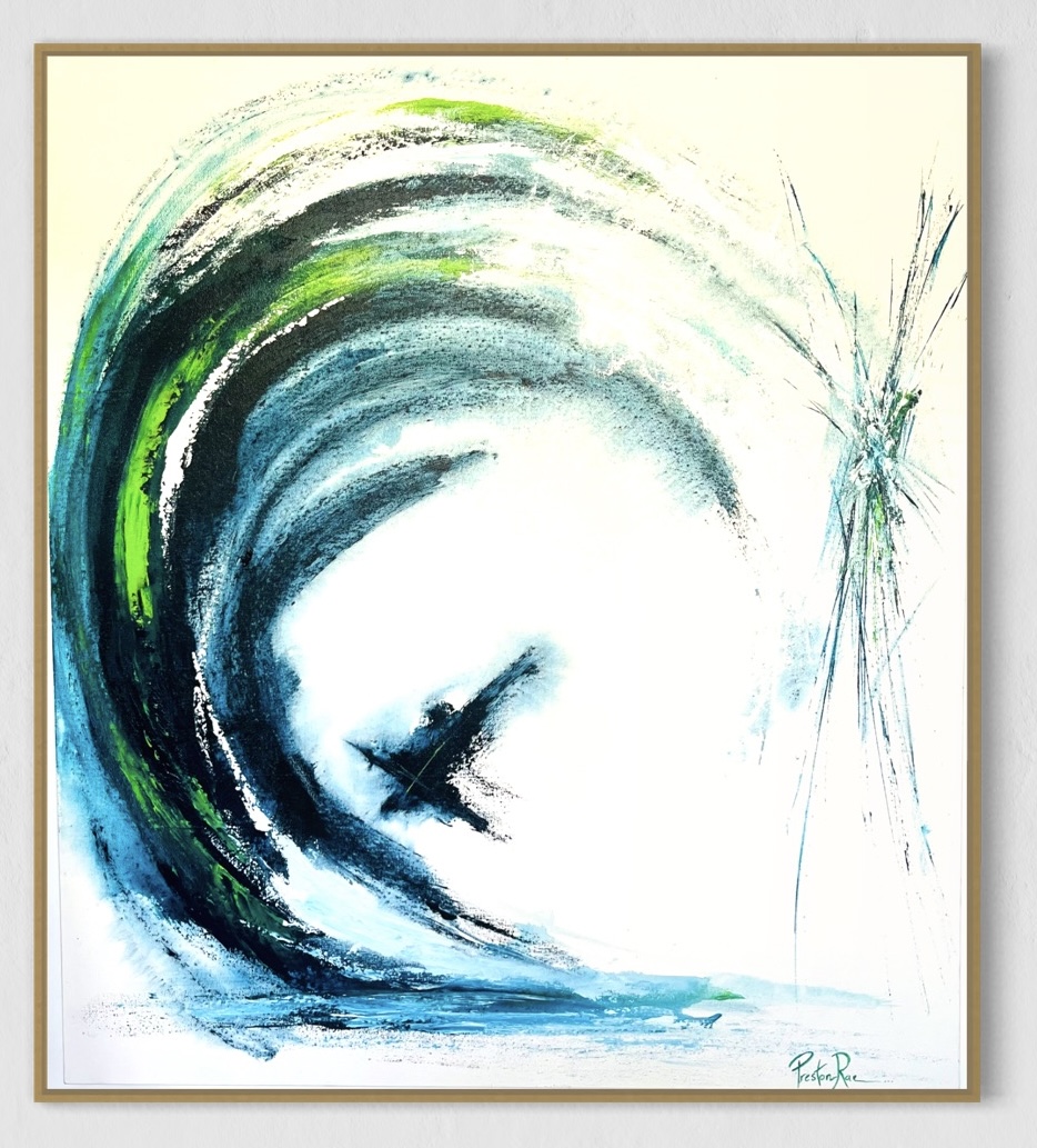 Introducing our Australian beach art painting, a striking expressionistic piece that captures the raw energy and beauty of Australia’s iconic surf. The painting features a surfer riding the barrel of a massive wave, perfectly embodying the thrill and power of the ocean. The water is alive with vibrant shades of blue and green, swirling and crashing in dynamic motion, while the clean, contemporary white background makes the colors of the wave really pop.