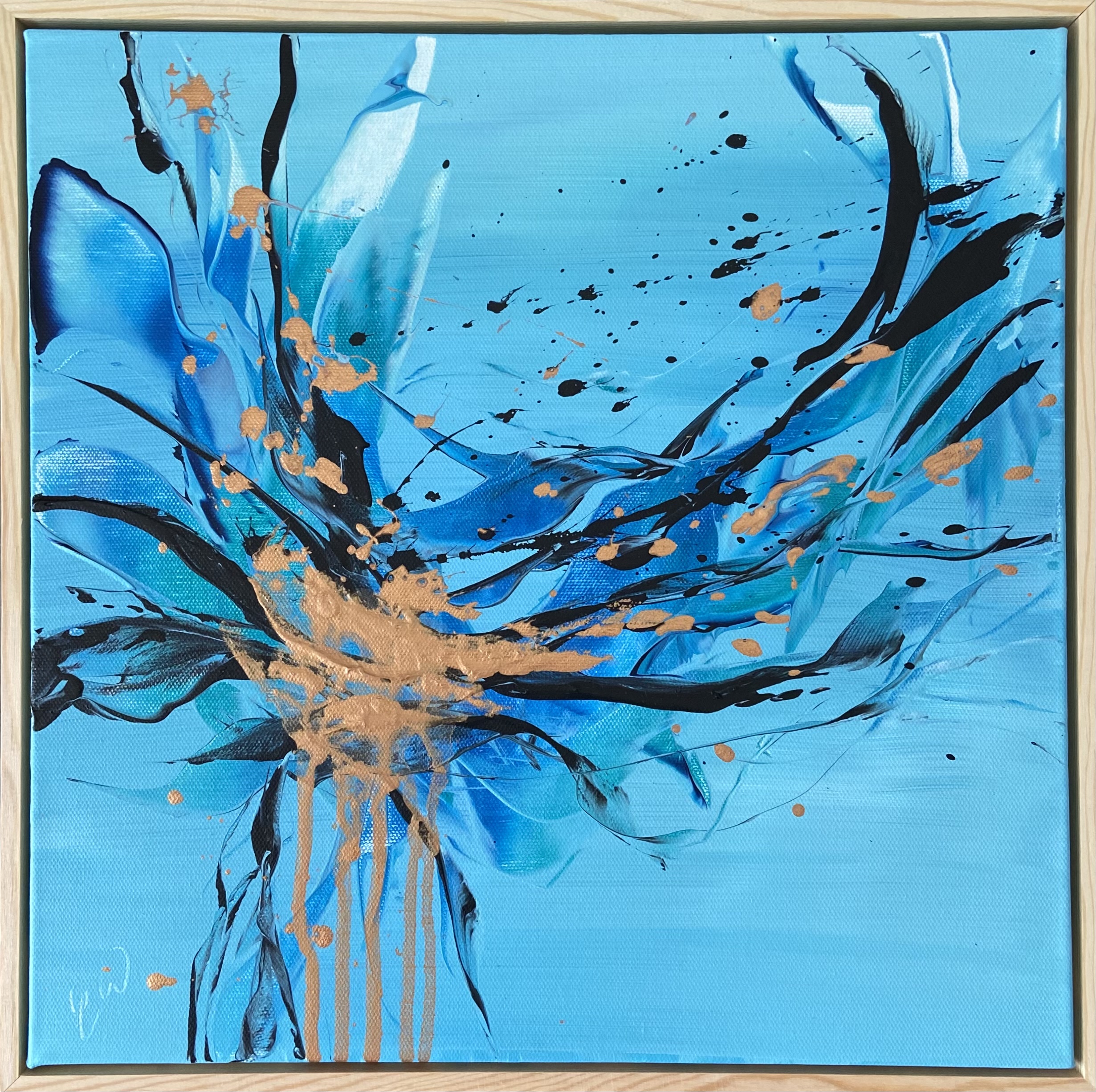 A captivating textured abstract piece with shimmering metallic accents that shine beautifully. This painting will bring life to any space. Canvas is 35.5 x 35.5 x 5 cm. Acrylic on canvas with wooden frame. Ready to hang. (Measurements with frame are: 38 x 38 x 6 cm).