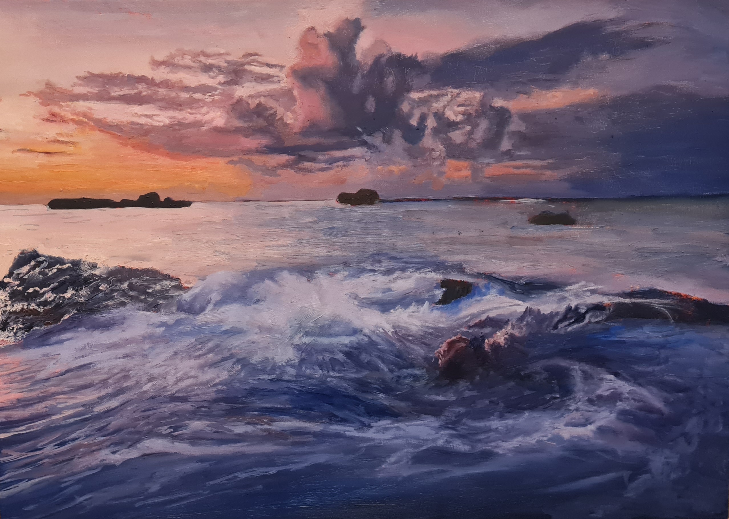 This artwork reflects a deep appreciation for the raw beauty of the natural world. Influenced by Romanticism and impressionist styles, the piece balances realism with expressive, flowing brushstrokes. The interplay between the vivid sunset sky and the textured waves conveys the energy and calmness of the ocean. Ideal for those who love coastal themes or nature-inspired art, this painting brings a sense of peace and vitality to any space..