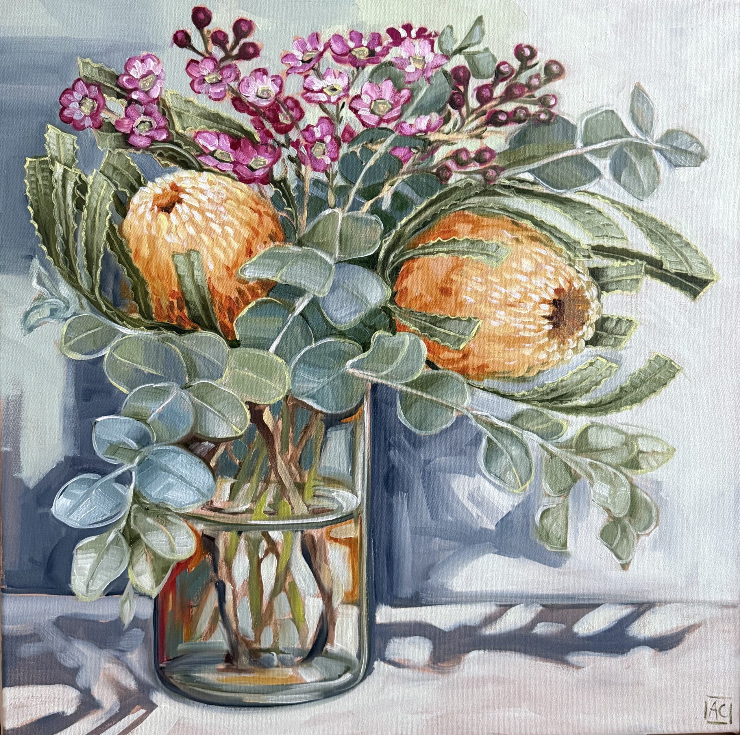 Found some gorgeous pink and white Geraldton Wax flowers this week along with some sweet small banksia flowers. Popped in a thick vintage glass jar with some nice shadow work from the winter sun