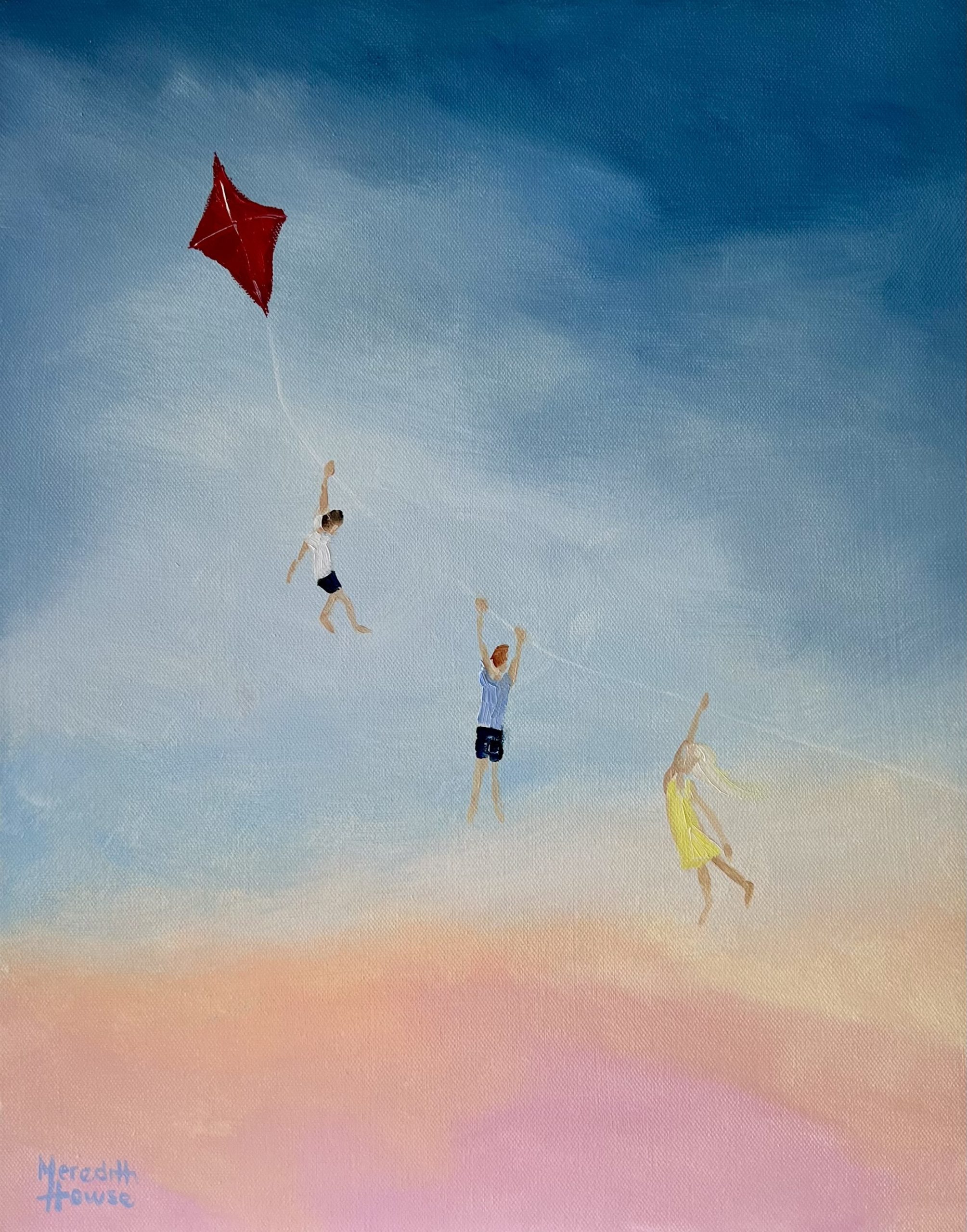 The picturesque sky colours and careful brushstrokes of figures convey a sense of atmosphere and season. The red kite and children a symbol of the freedom of youth.