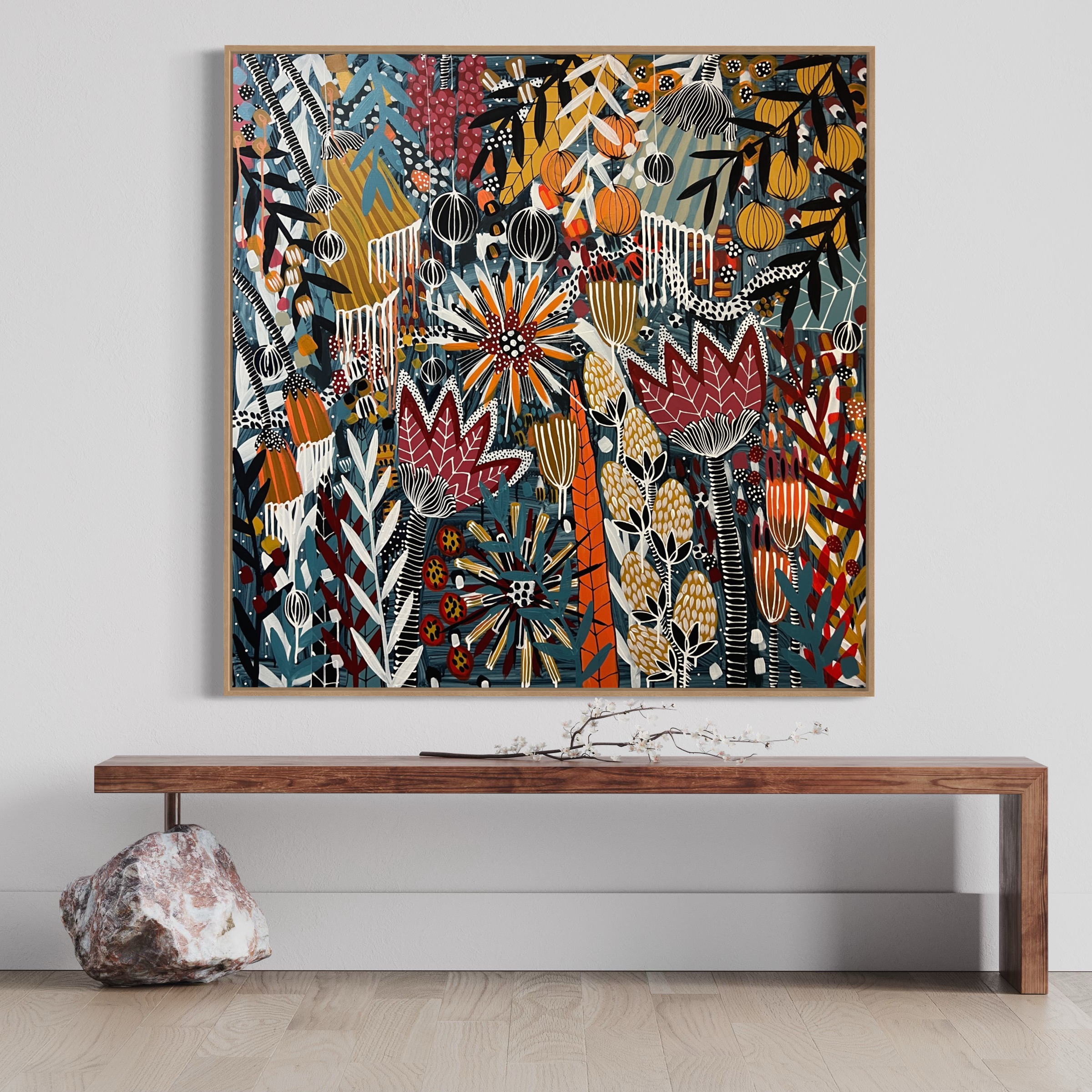 An original artwork on triple primed gallery quality canvas, ready to hang in sustainable hardwood float frame. 122cm x 122cm canvas size (125cm x 125cm framed)