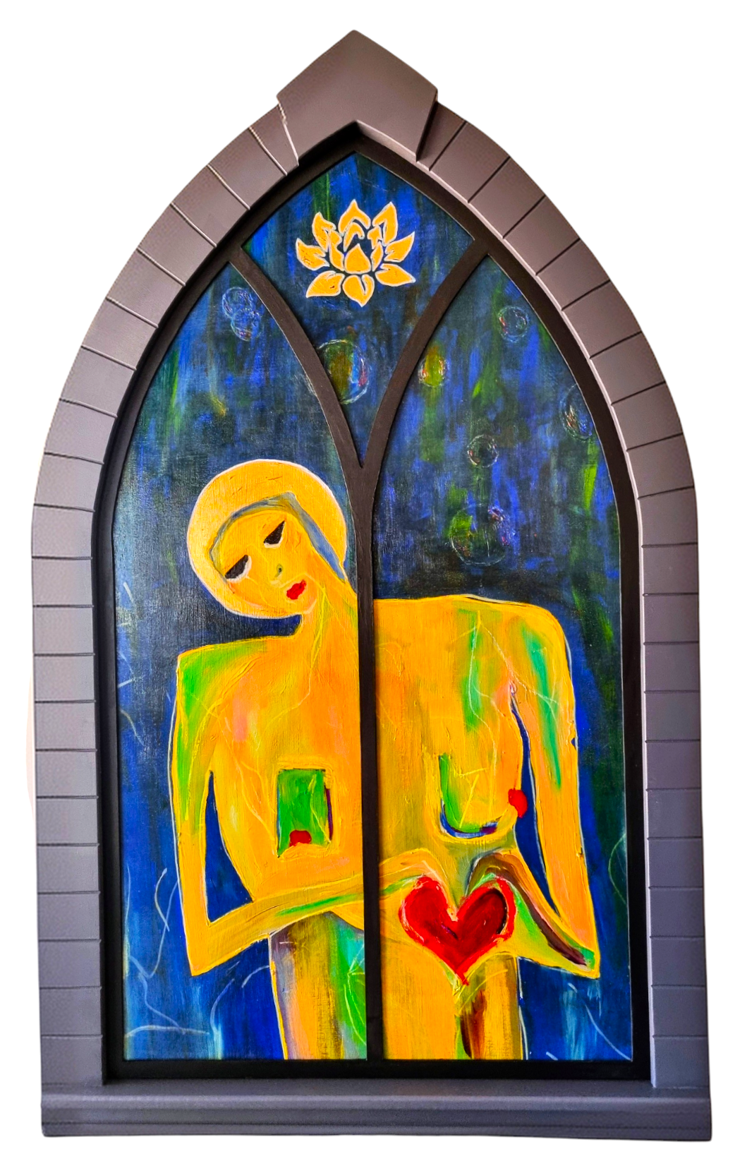 Looking in through the gothic archway we are a silent witness to love. A saintly motherly figure radiating love glows whilst offering her heart in an unconditional self-sacrificing gesture. Agape love is giving one’s all with no expectation of return. The lotus a symbol of the pure human soul, of agape love, its presence at the highest point is totemic. The lotus is a remarkable flower that blossoms in perfect form, yet its roots lay in a muddy slimy environment –an imperfect world. The bubbles floating in the background are a metaphor for the transient nature of life. It’s inability to sustain its own weight, bursting-highlights the fragility of life and the importance of giving this agape love. This kind of love makes us safe, secure, happy and allows us to blossom like the lonely lotus