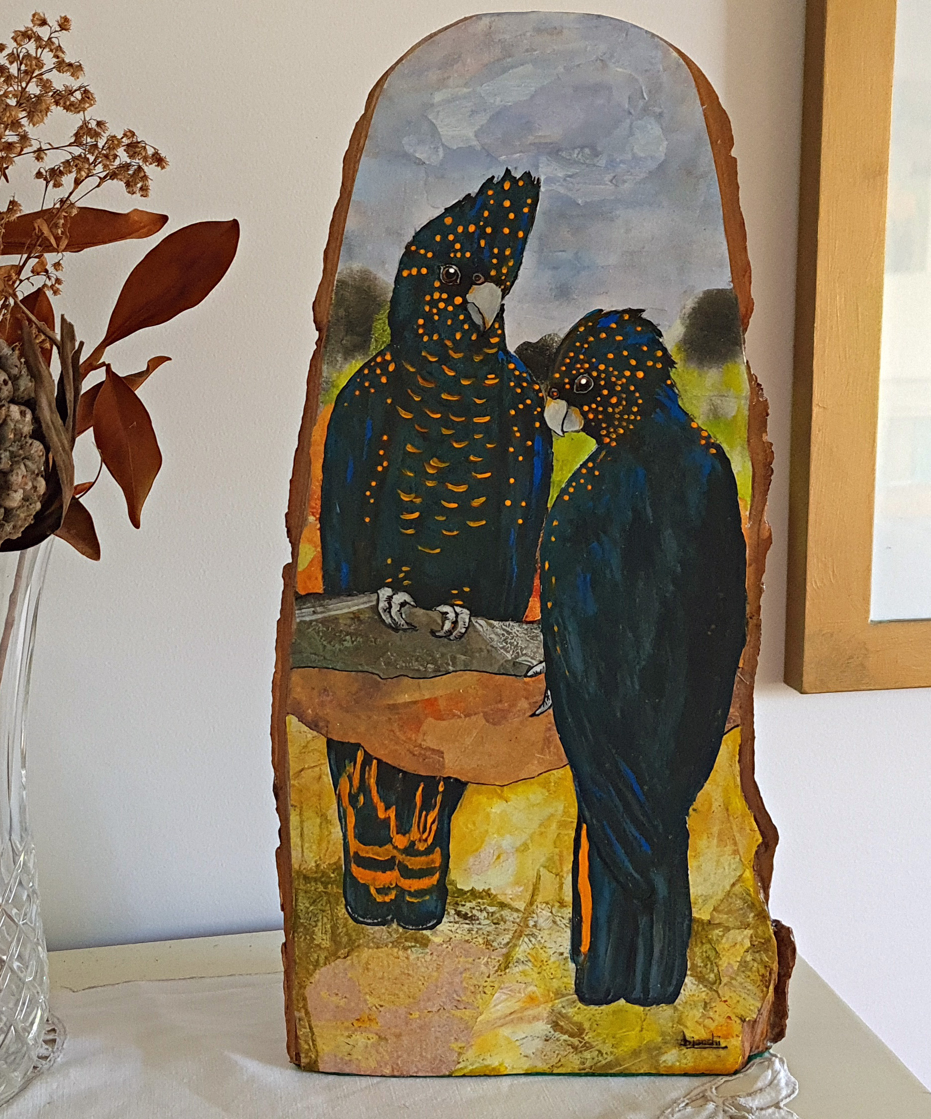 These lovely guys were created using acrylic paint on a piece of timber that I found when I visited the local Woodworkers Workshop. They are happy for me to select pieces from their discarded bin, should I find a treasure! Each piece of timber is unique as trees mature differently depending on where it grew and what environment it matures in.