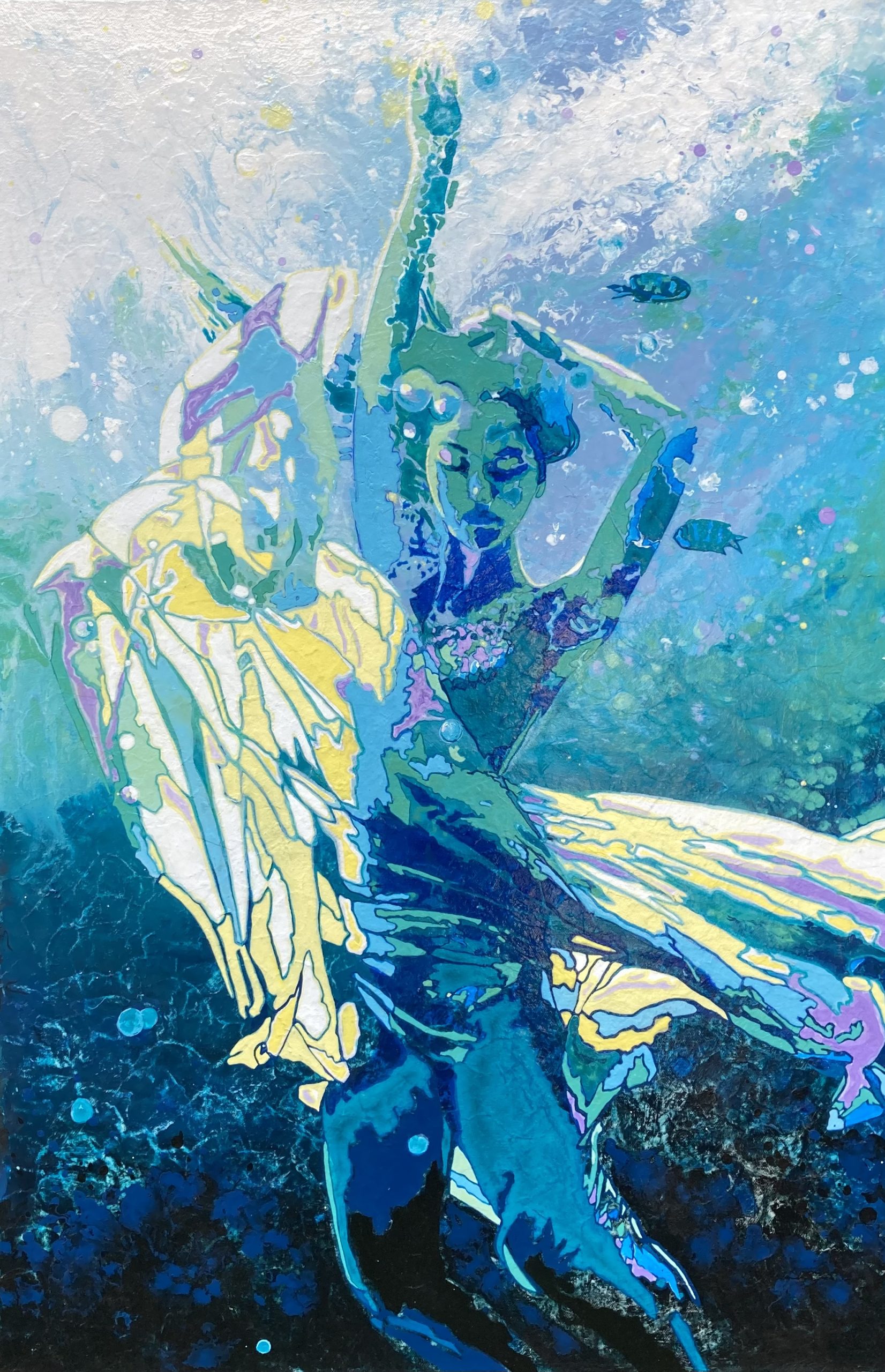 The canvas is covered in Japanese Rice Paper to give a lovely texture that is akin to the movement on the surface of water. And, as with most of Kerry’s paintings, she has painted in layers. The background using action painting (expressionistic) techniques – pouring, dripping, splashing paint and involving her body in the painting process rather than just the paint brush. The figure was created using contemporary art pop art techniques and stencils, and a further layer of hand painting brought the foreground and background together. Mostly consisting of greens and blues, Kerry has also used complementary colours purple and yellow to highlight the dress in the sunlight under the water.