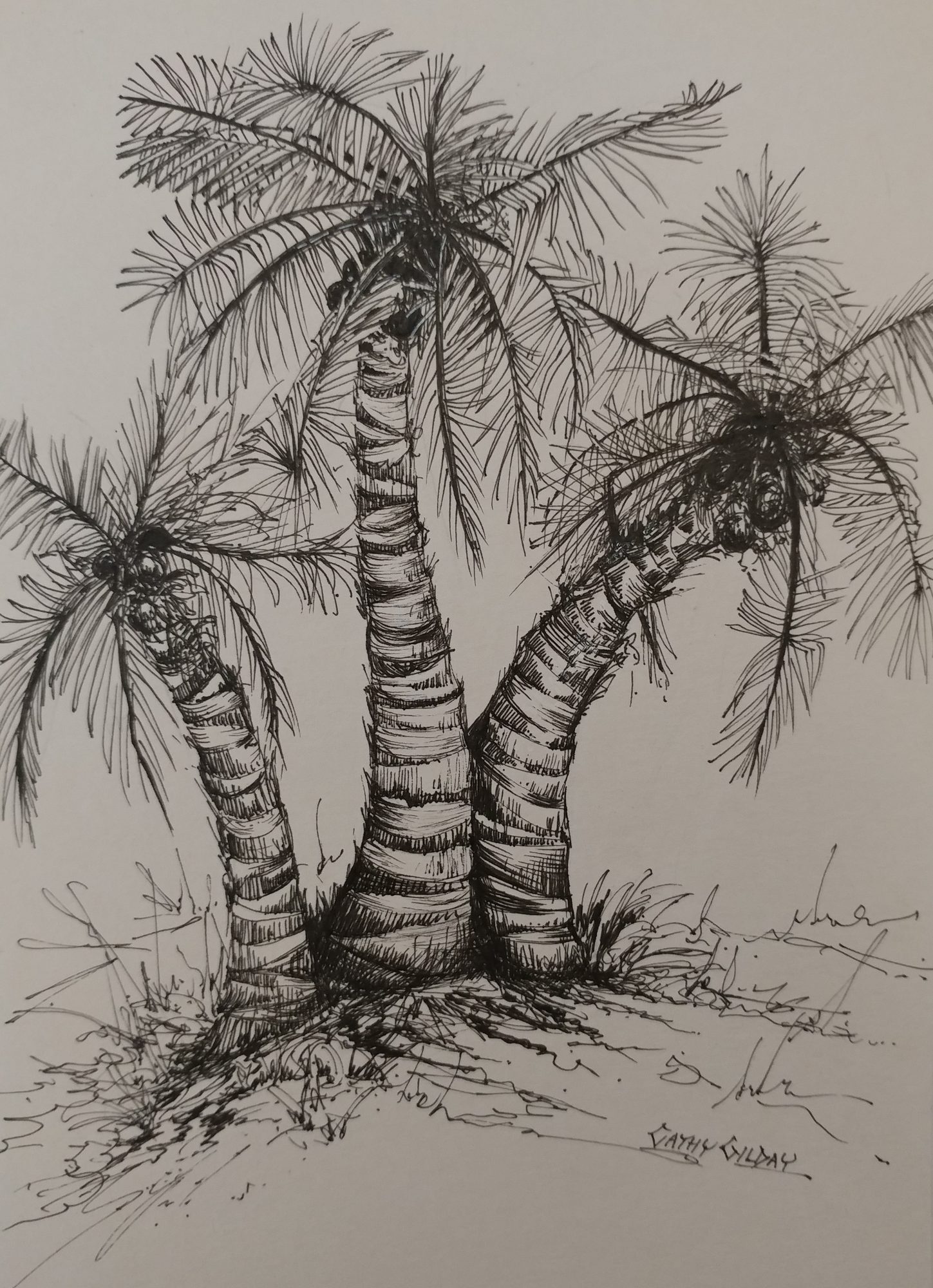 We Three by Cathy Gilday – It’s difficult not to be inspired by all the lush tropical plants and swaying palm trees while travelling through the island of Bali. I loved this little clump of three palm trees and just had to go back to the hotel and draw them!