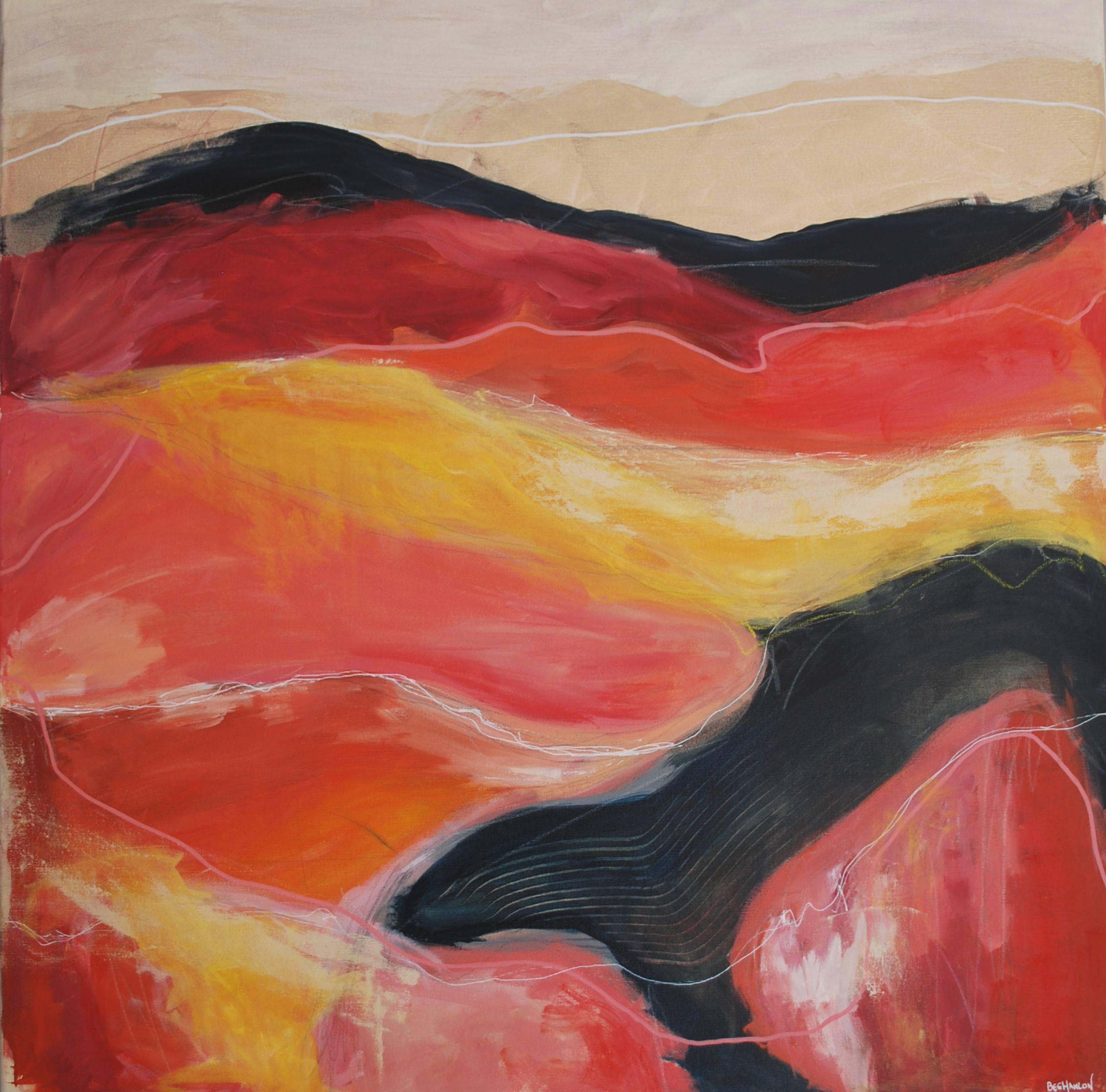Weaving in and Out – This painting is a loose abstract landscape. Inspired by real and imagined landscapes from rolling hills to waterfalls and everywhere in between. I work mainly in acrylic and a variety of mixed media (oil pastels, pencil, graphite, makers) on canvas and paper and work intuitively to create my abstract pieces. Drawing inspiration from real and imagined landscapes that surround my studio in the Manning Valley and also from locations that I have seen on my travels.