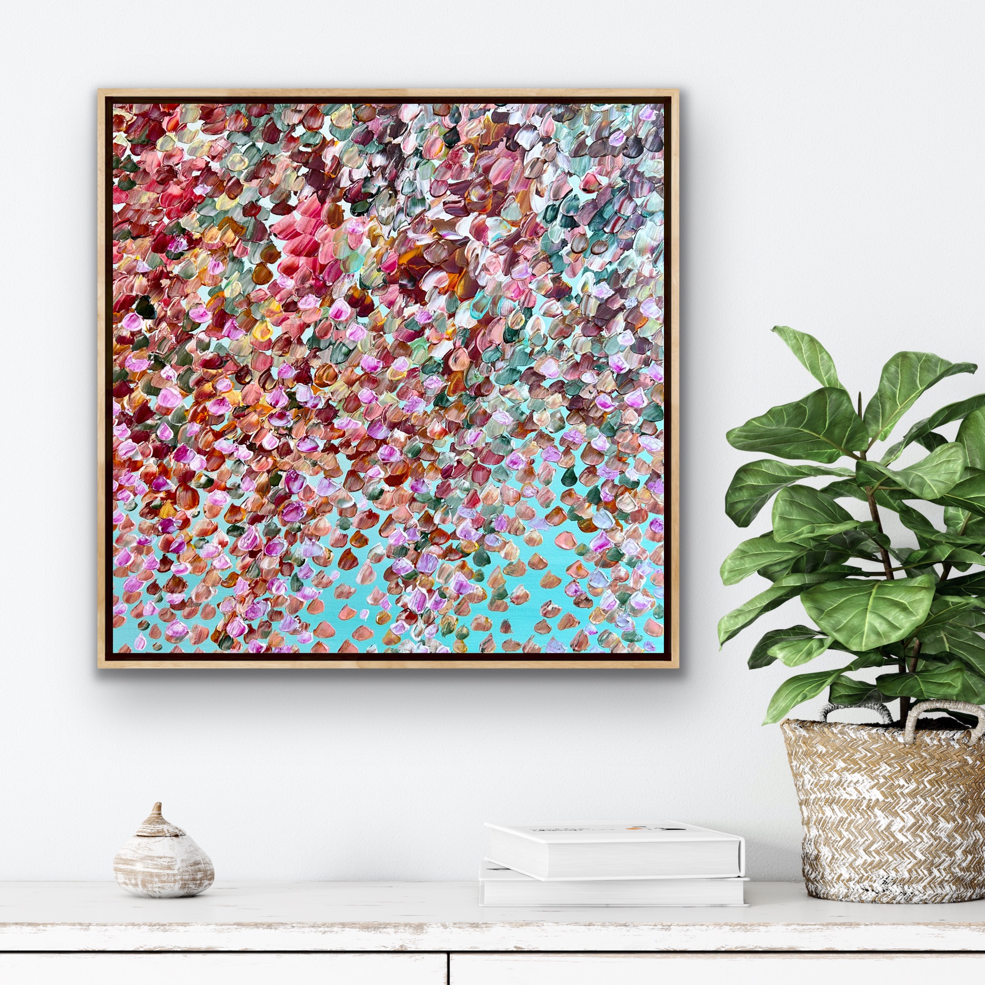 A painting with warm and cool colours of the petals flying in the wind creating this beautiful bouquet of petals in the sky with lots of layers of paint and texture painted with a pallet knife. Flickering petals dancing in the sky like shining stars creating beautiful rhythms in the Sky . Petals weeping onto the landscape creating this veil of petals covering the sky with lots of layers of rainbow colours . A composition of colours and rhythms of petals dancing like musical notes creating fireworks in the sky . A very peaceful and tranquil painting with so much depth. The painting does not come with an external frame.The painting is signed and dated 2023 at the back and comes with a certificate of Authenticity.