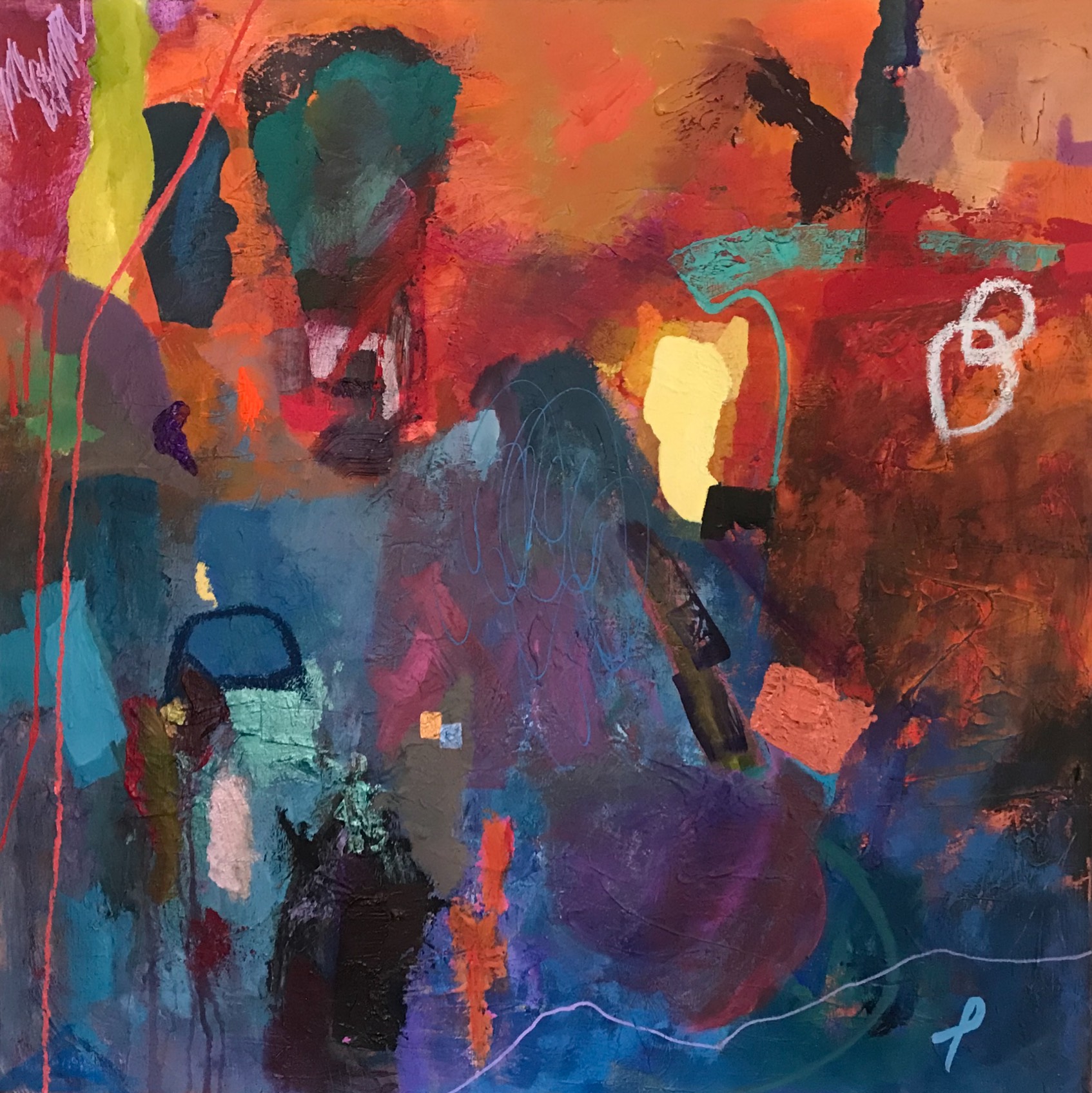 Constantly searching for luminance and a descriptive manifestation of joyful colour this painting ‘feels’ right to me with the inclusion of texture, metallic finishes and oil pastels.