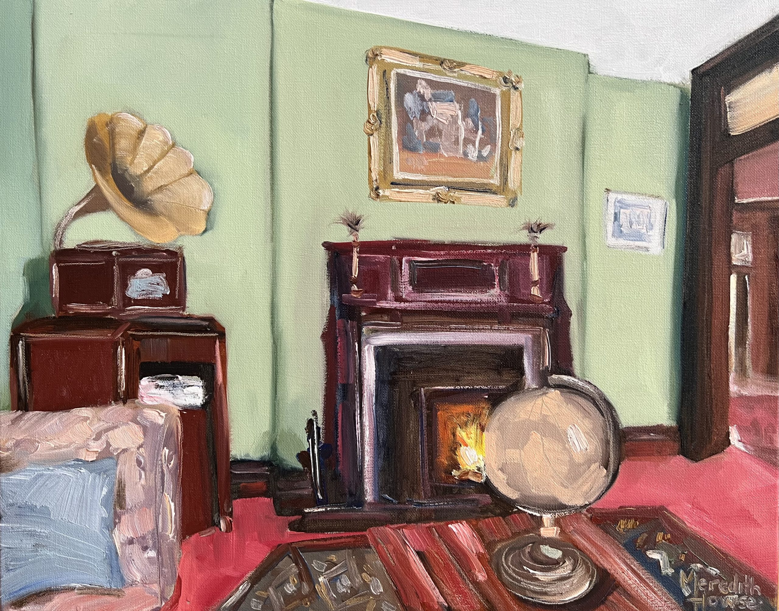 A elegant oil painting of a sitting room in an historic home in Inverell. Here the artist conveys the welcoming warmth of the room using rich reds, olive/mint green and a welcoming fire in the hearth. This is a heritage style painting of a bespoke wood crafted, formal sitting room.