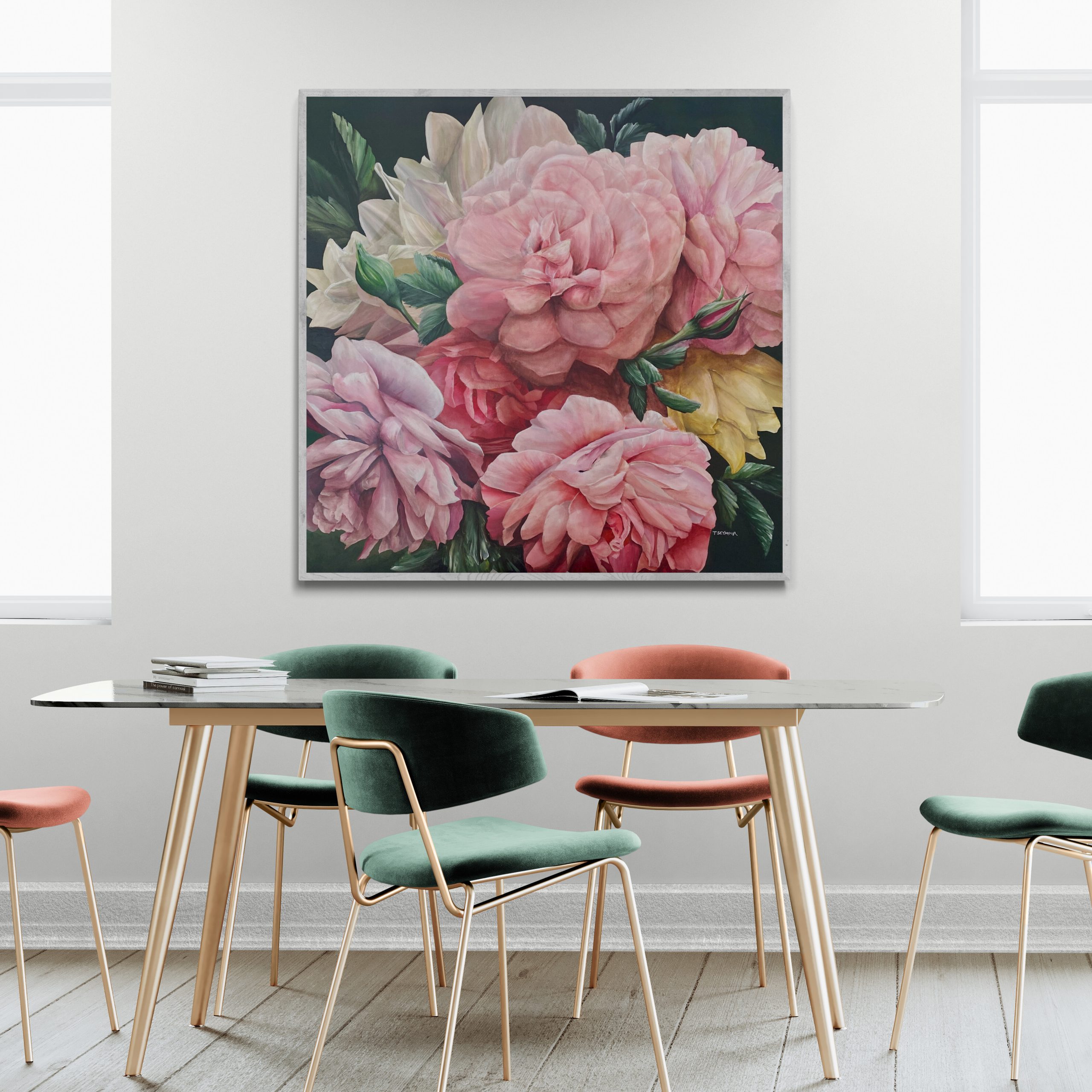 Pink flowers can symbolise a variety of emotions, including love, joy, and gratitude. They can also represent femininity, grace, and elegance. This piece showcases a variety of pink blooms and I hope they embellish all that is love, life and elegance.