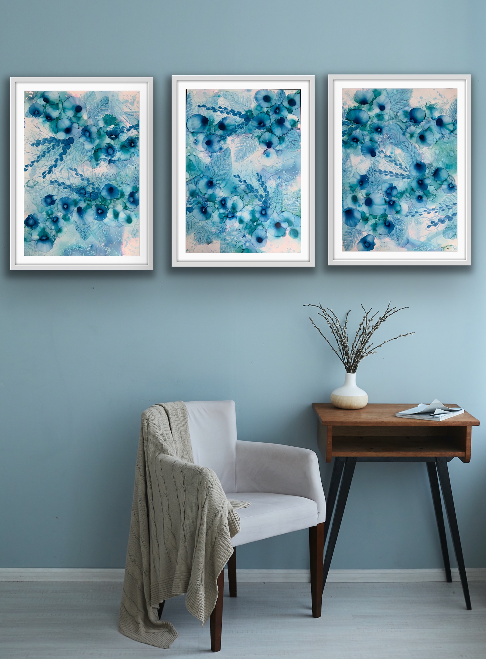 Original triptych 65 cm x 91 cm x 3 Alcohol ink on yupo paper sealed with high grade varnish and UV spray.