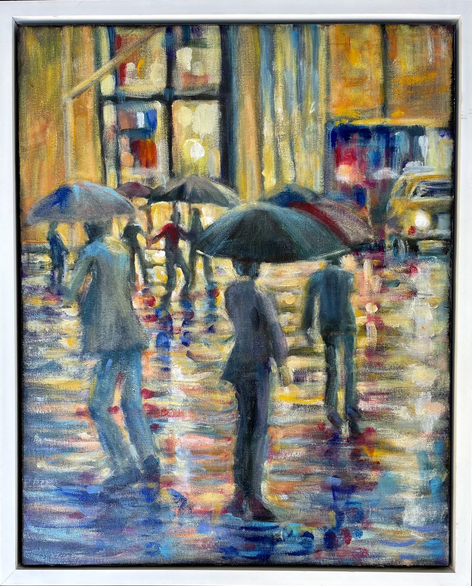 This acrylic painting is of a wet street with people caught in the rain and umbrellas silhouetted in the lights of stores and car headlights.  The inspiration for the painting came to Sue from a reference of a New York street scene.