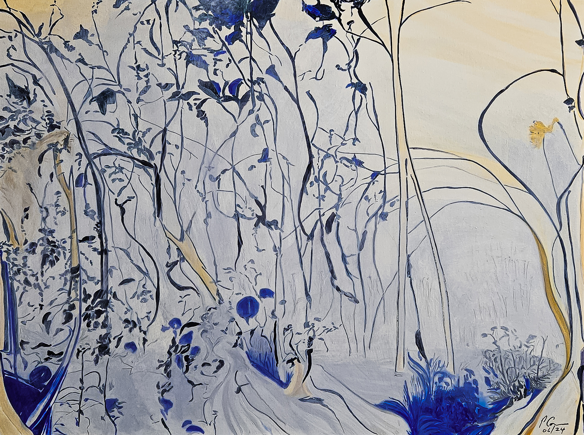 The painting “Wetland Mist” captures a tranquil scene of flowered wetlands, enveloped in the early morning’s soft mist. The shades of blue, white, and grey used in the painting enhance the peaceful atmosphere, evoking a feeling of being surrounded by nature’s beauty.