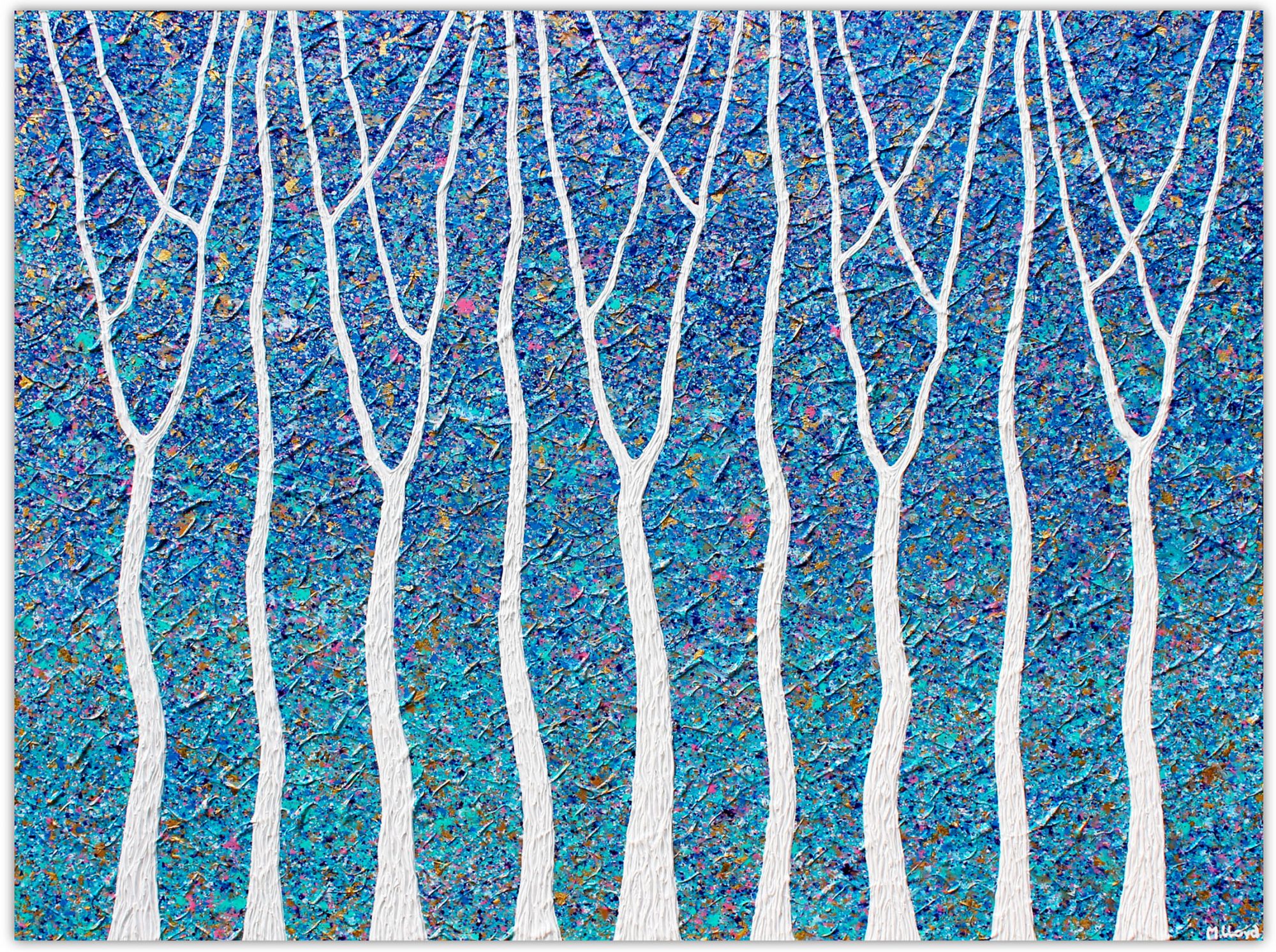 A new version of my trees have created a wetlands gum tree scene. I love spending my time in the bush and the beach so love to combine the two vibes. This is a heavily textured piece and the gold foils pick up nicely in the light. The background has a gradient from turquoise to deep blues.