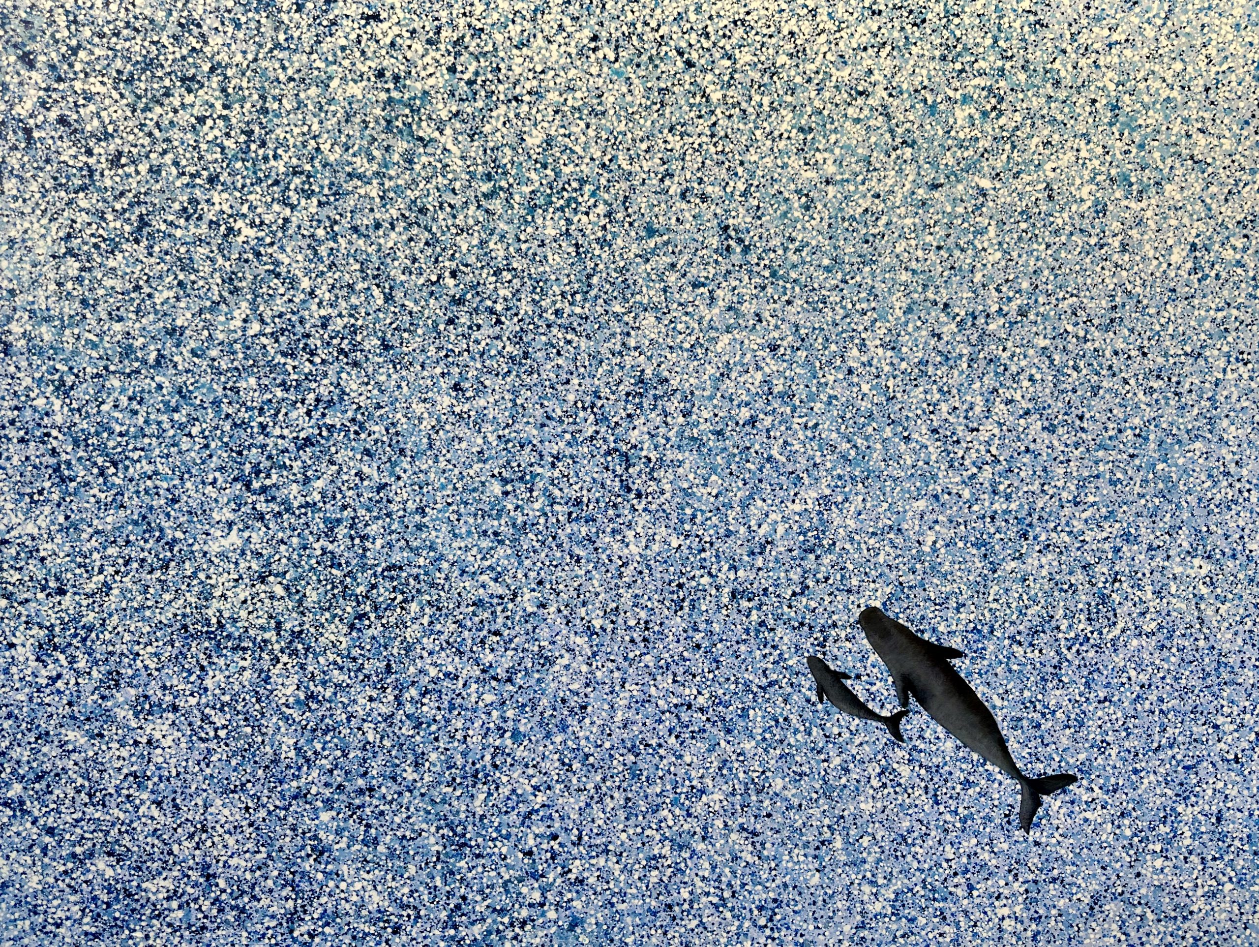 The painting depicts a mother whale and her calf swimming together, capturing the deep and powerful connection between a mother and her child.