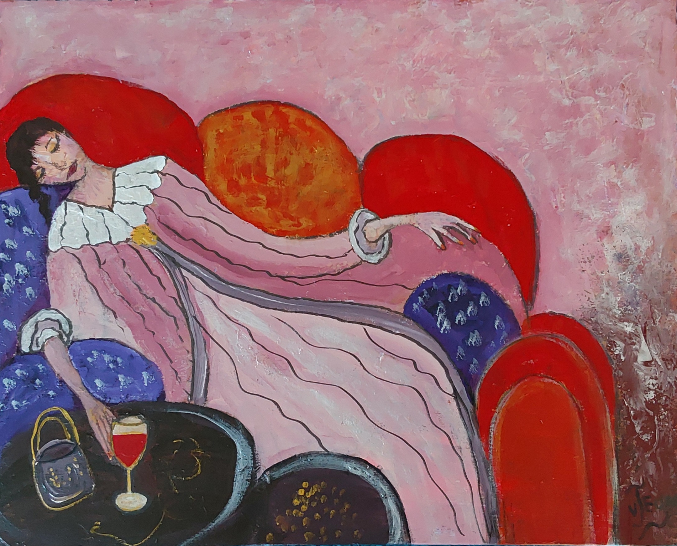 Relaxing at the end of a hard day, this colourful figurative piece is designed to make your feel chilled and will brighten any decor.