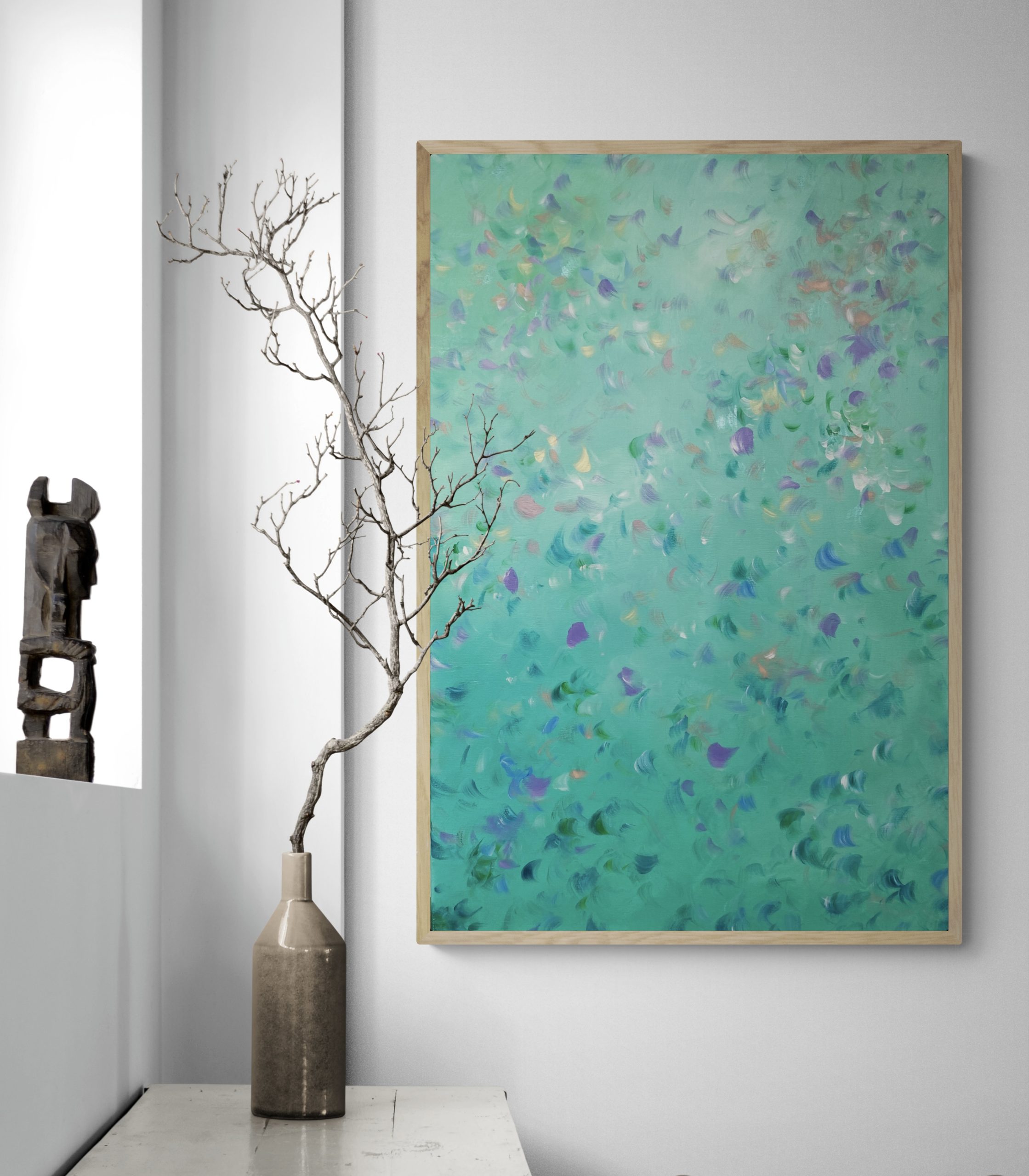 Petals float around the canvas in this abstract floral work that celebrates the joy of flowers every day.