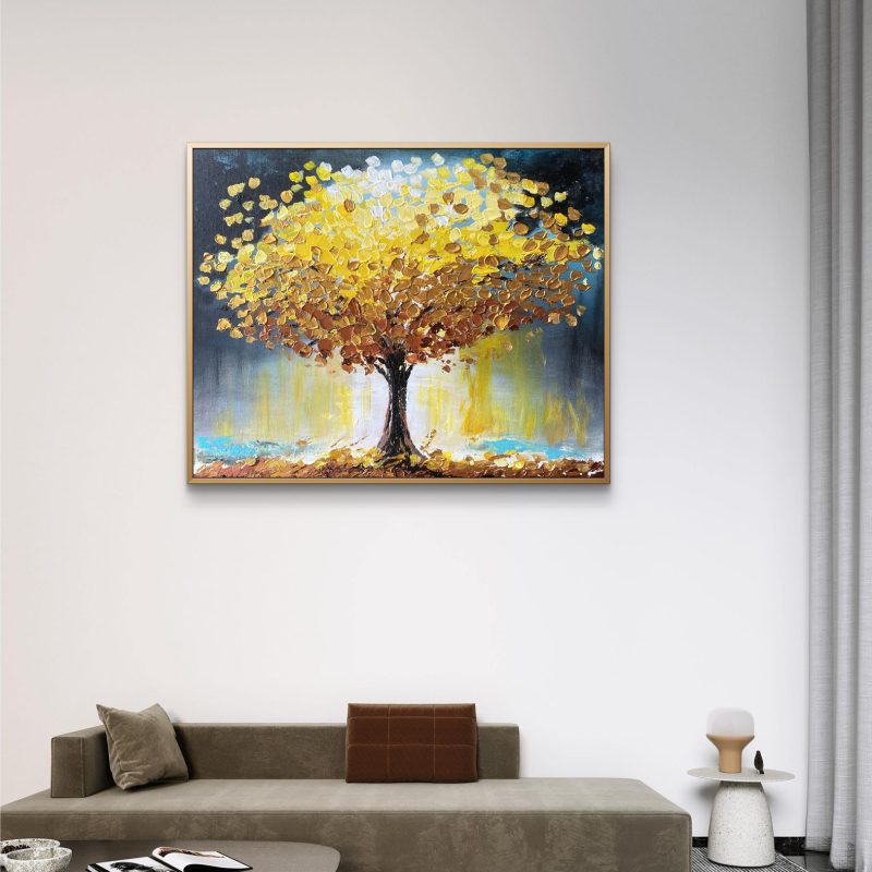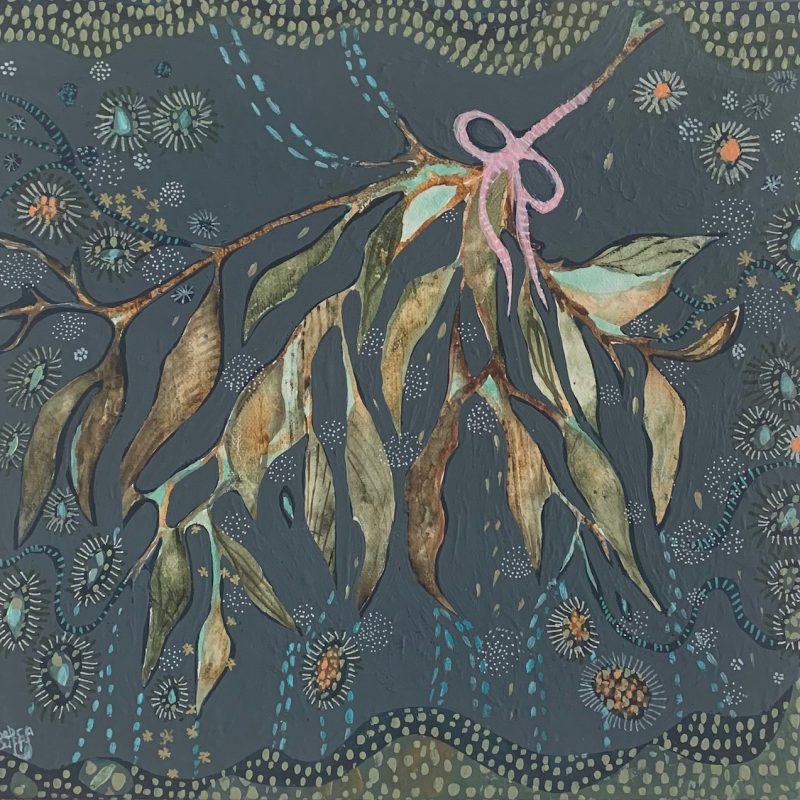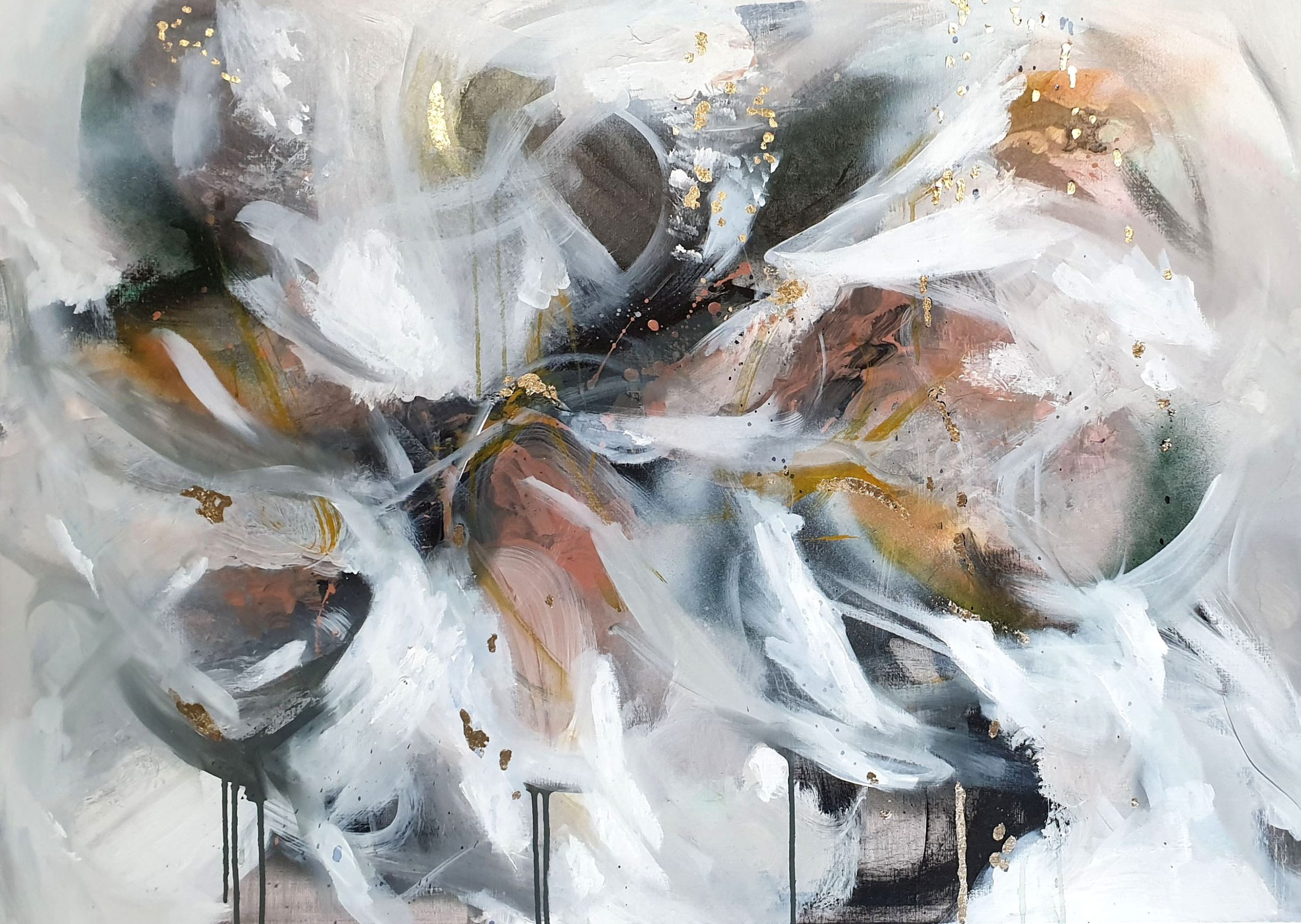 Mixed media on gallery wrapped linen canvas with a champagne real gold leaf. The artwork is textured and has colours of pink, grey, mustard, green, black and gold.