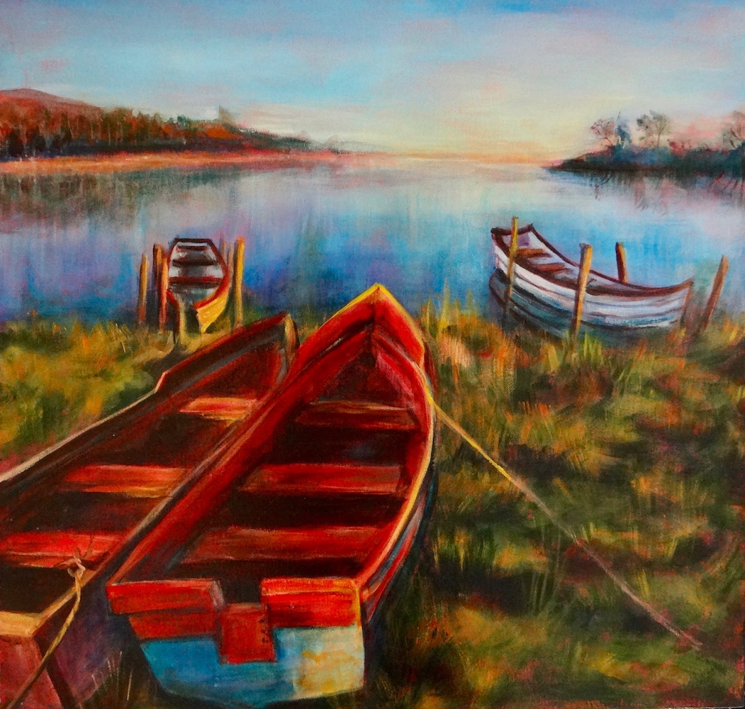 This is an original acrylic painting on a square canvas of a scene of boats both in and out of water. Â My aim was to capture the stillness of the fabricated scene with the sun hitting the boats.