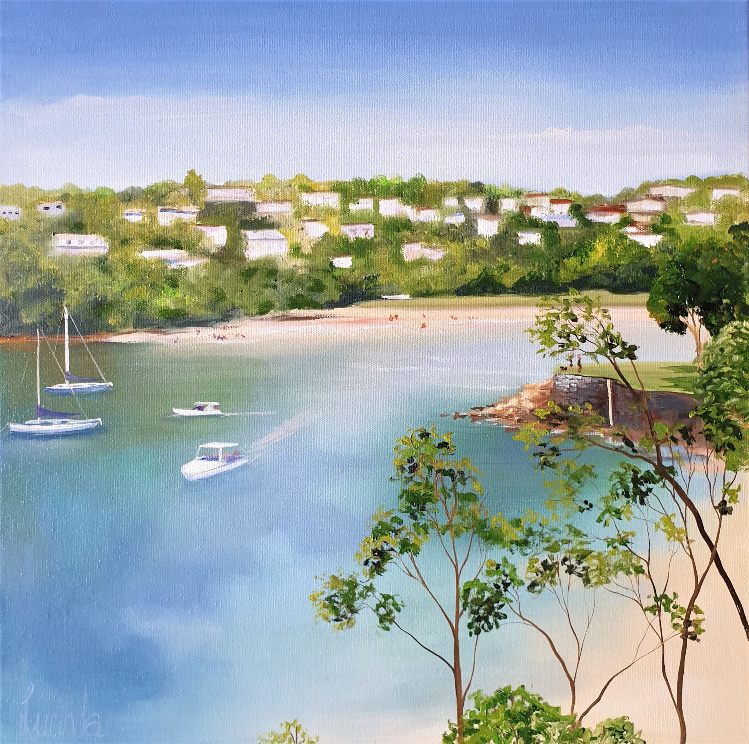 I grew up in Sydney, near Taronga Zoo – my days were spent at Balmoral Beach with my Dad, exploring the fantastic bushland with friends in the school holidays and taking the dog for walks around the harbour area. Feeling a little nostalgic I decided to paint a small series of works of the area. As a fan of AA Milne, I thought I might name the pieces ‘When I was young” – these paintings are different from my usual stormy skies and single trees – they are full of clear skies and blue waters and memories I cherish.