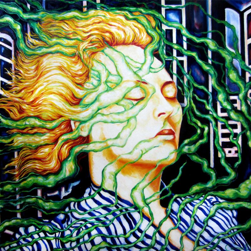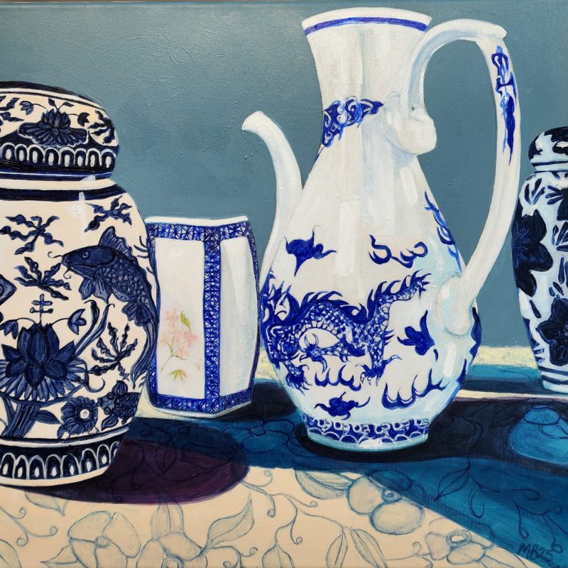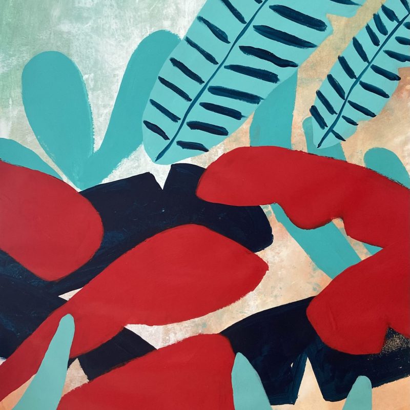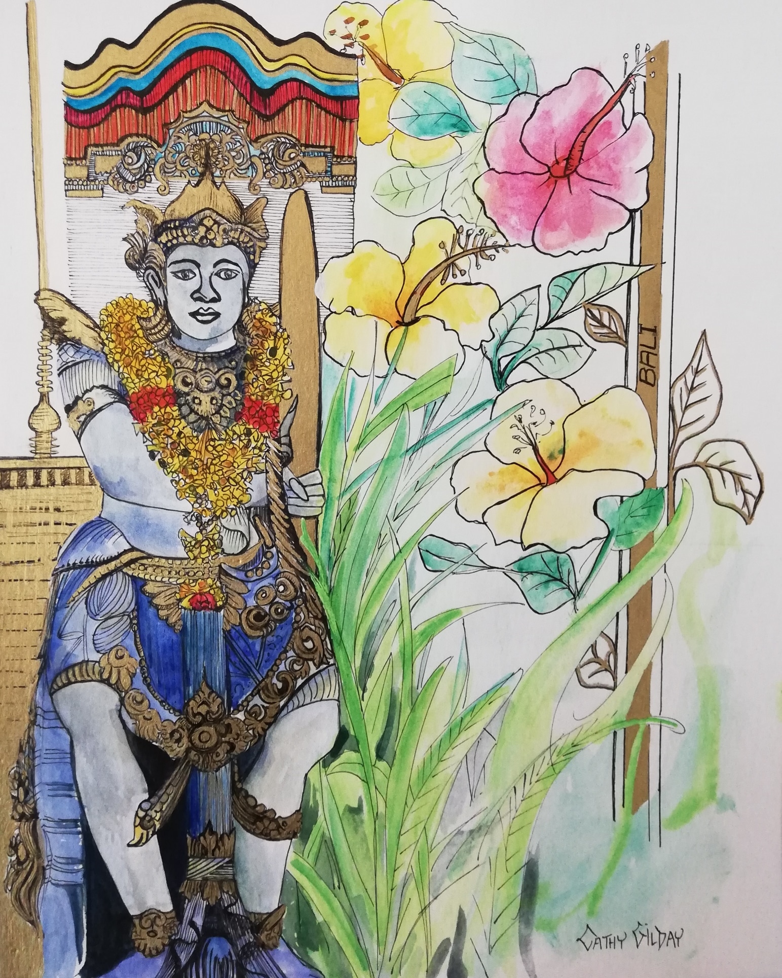 When in Bali by Cathy Gilday – Perhaps it’s the fact that I learnt Indonesian at high school, that has given me an interest in Balinese culture. I love the fact that they are such gentle people with very spiritual beliefs. Travelling around this lovely island, it would be difficult not to come across these large ornate stone carvings, which stand guard at the entrance of villages and temples. They are usually decorated with gold trims and colourful floral leis. I have tied in the lush foliage and tropical flowers which also feature everywhere.