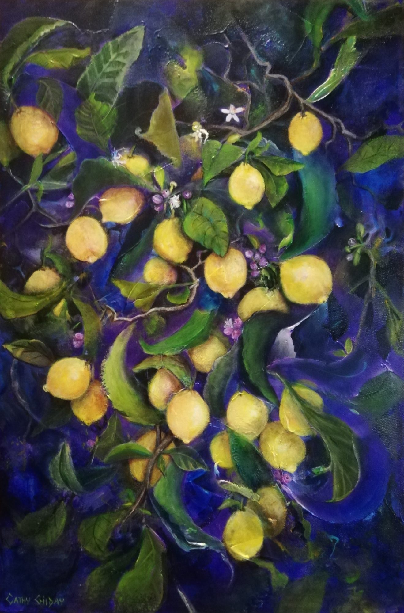 When Life Gives You Lemons by Cathy Gilday –Â Like many of my artworks, I began this painting as a heavily textured abstract. Using the phrase, “When life gives you lemons, make lemonade,” as the inspiration for this work, I then painted this busy composition a lemon tree, laden with fruit, a metaphor for making the best of life in difficult times. Sides painted, sealed and ready to hang.